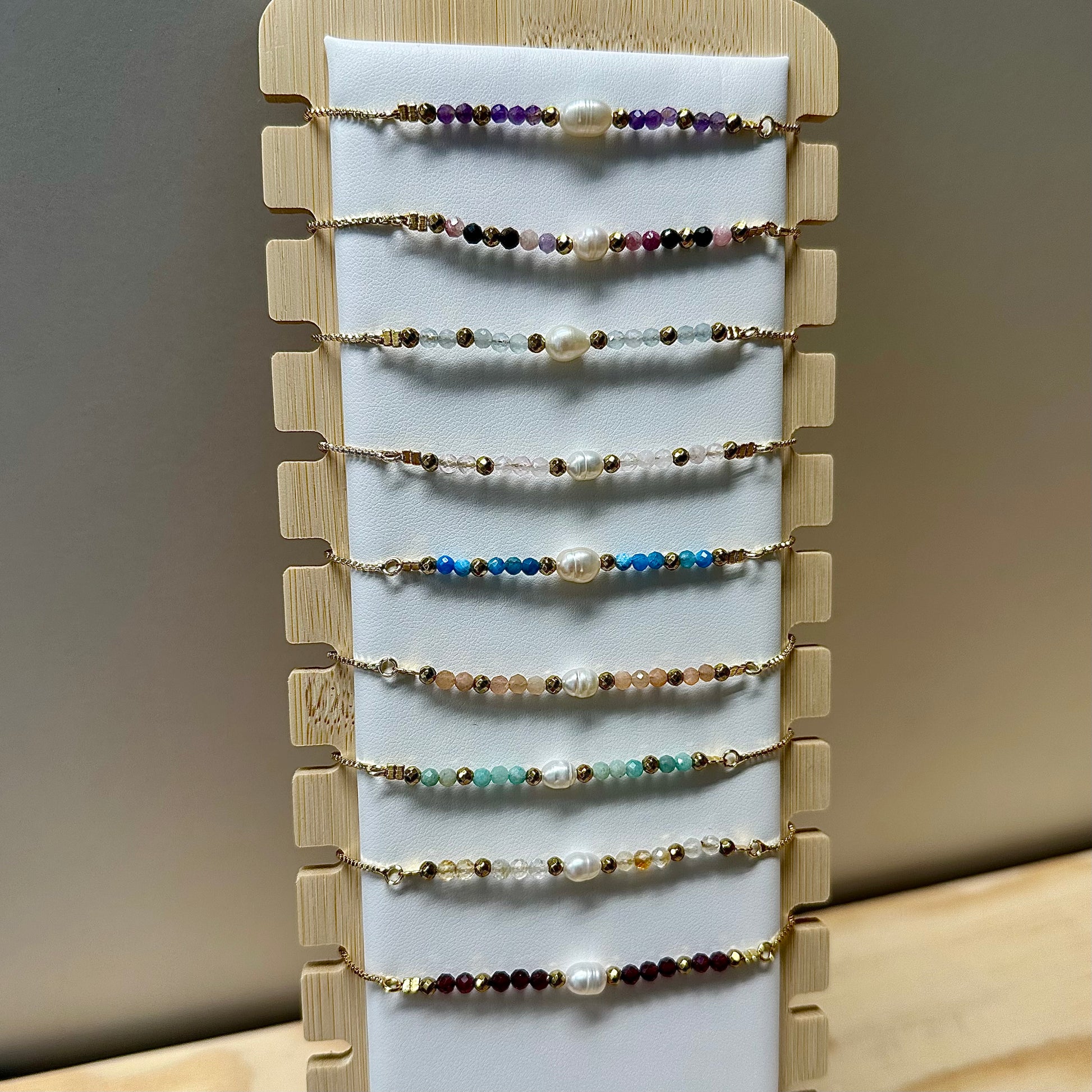 Armbandjes met kraaltjes in diverse steensoorten met een parel.