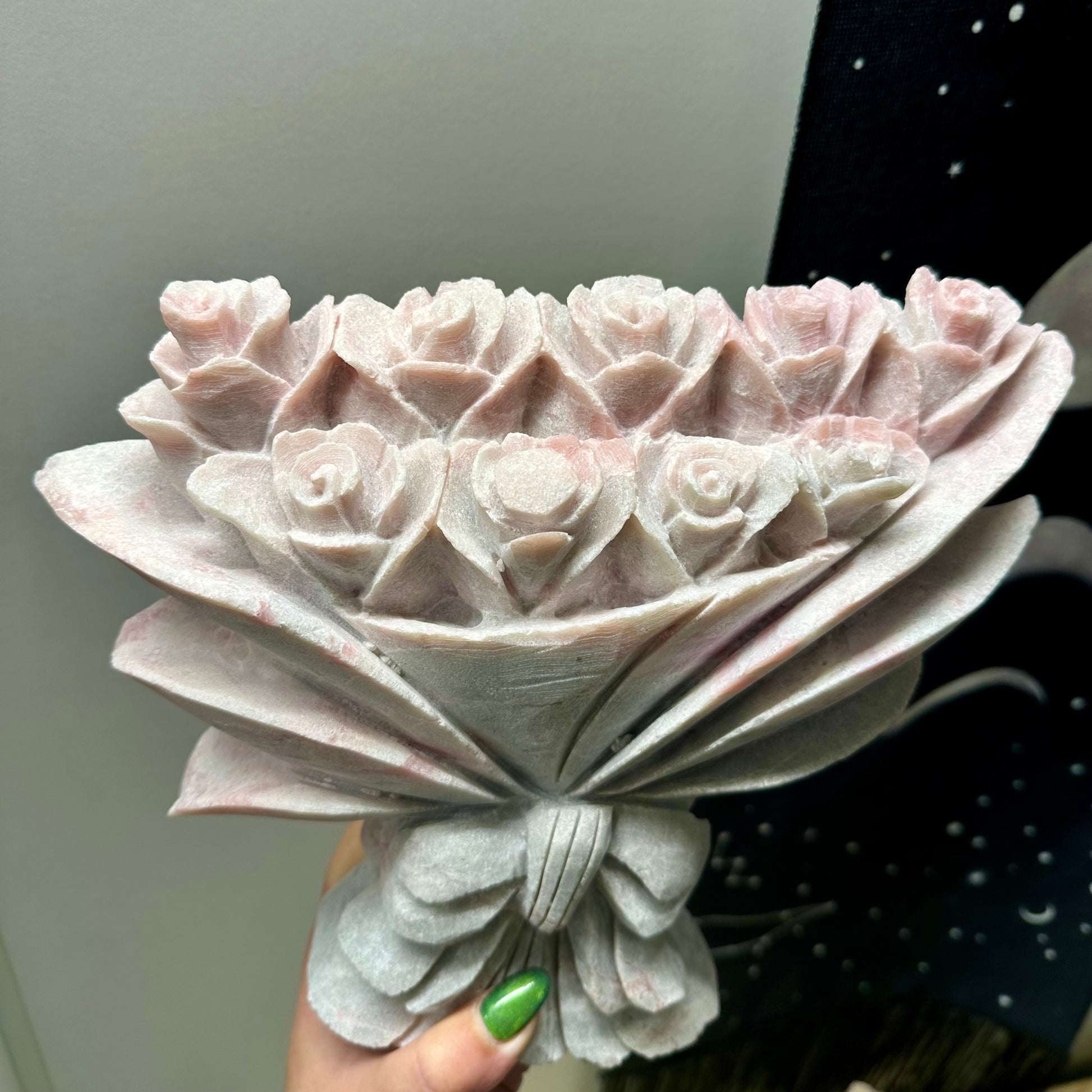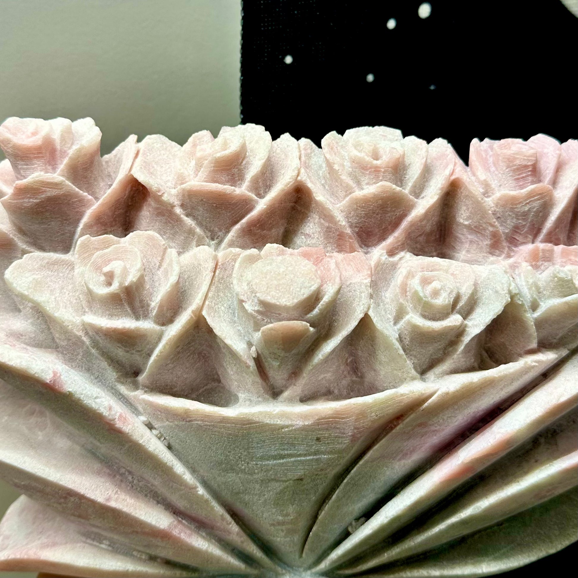 Prachtig gecarved, zowel aan de voor- als achterzijde. Alleen één roos is niet helemaal gecarved.