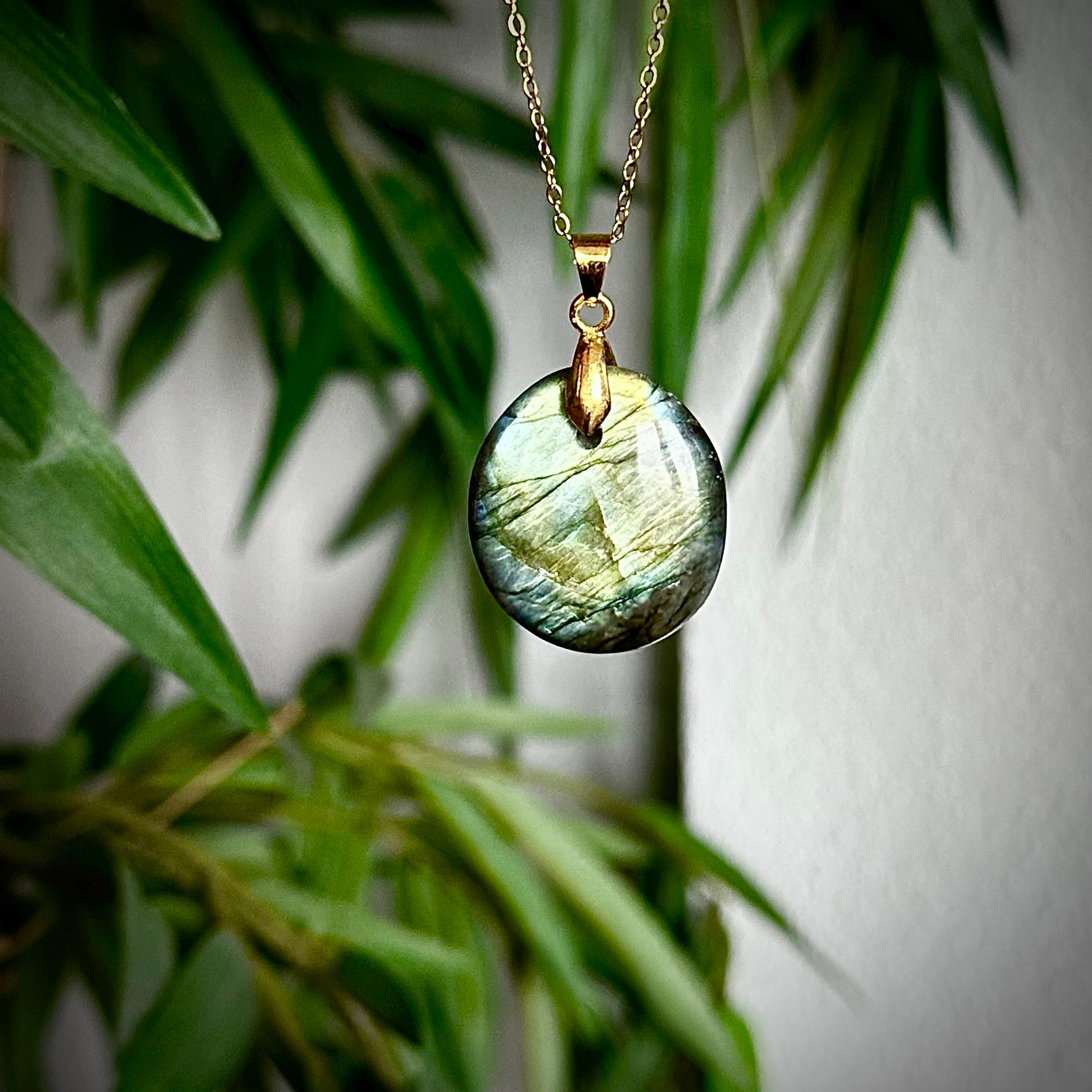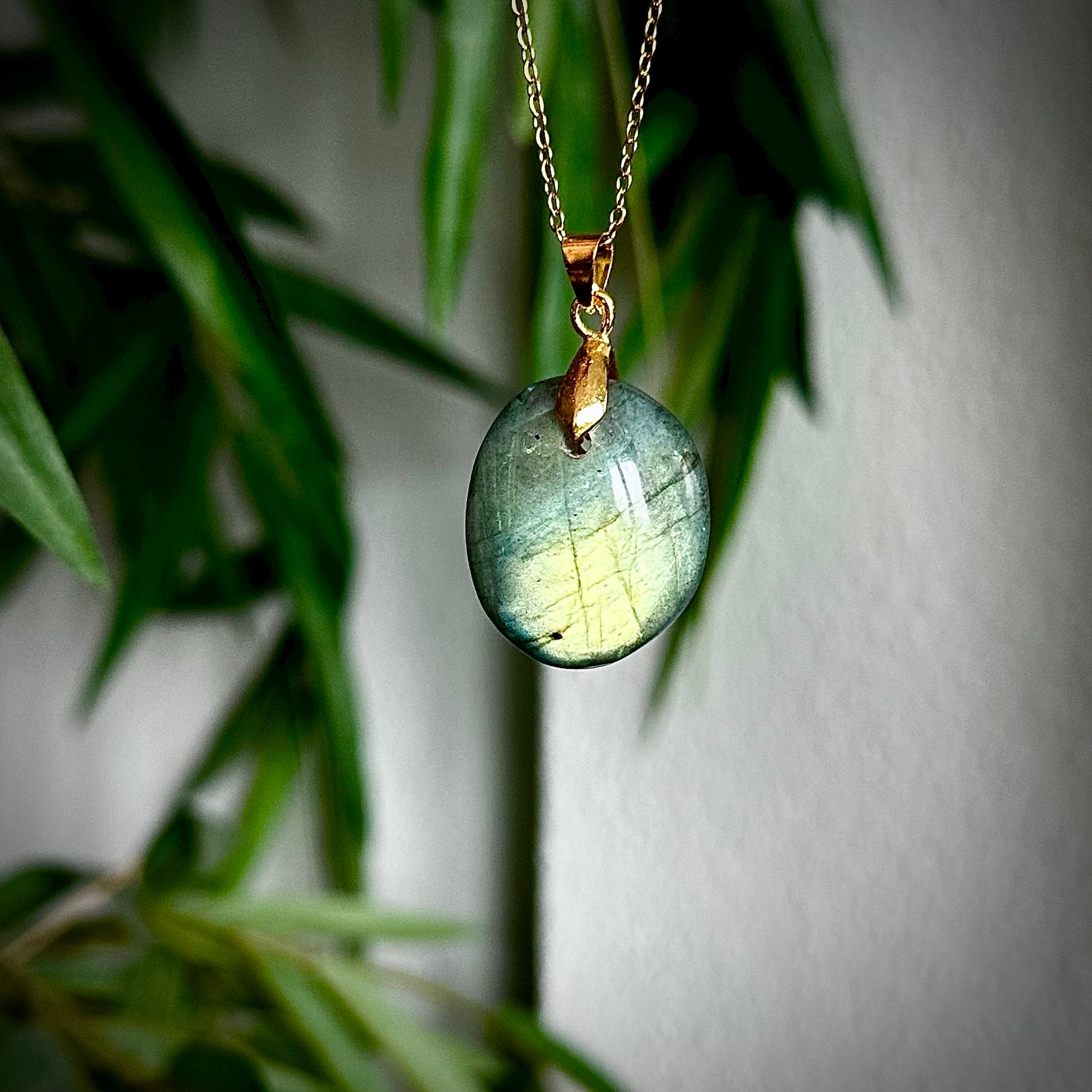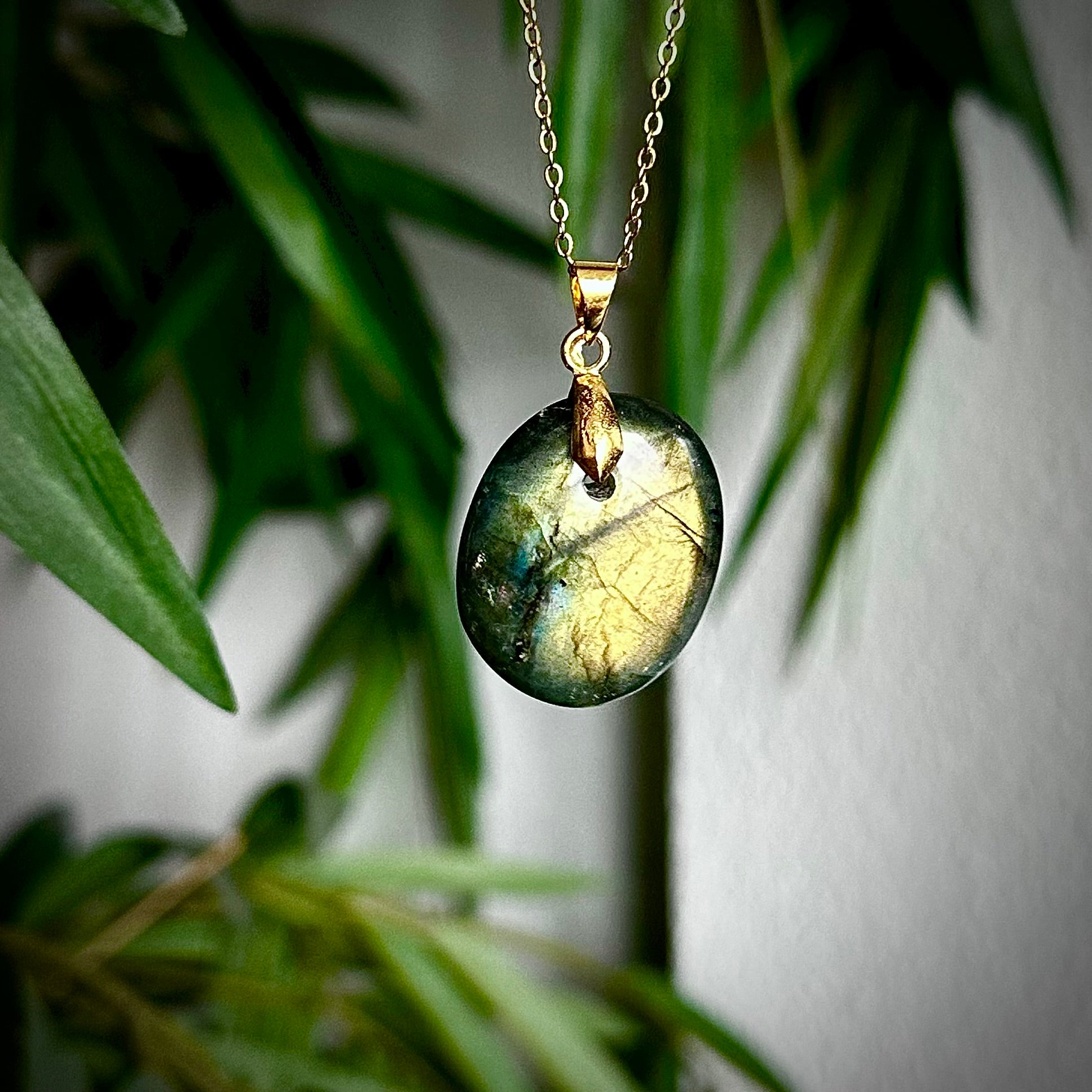 Labradoriet kettinghangers met een goudkleurig hangertje.