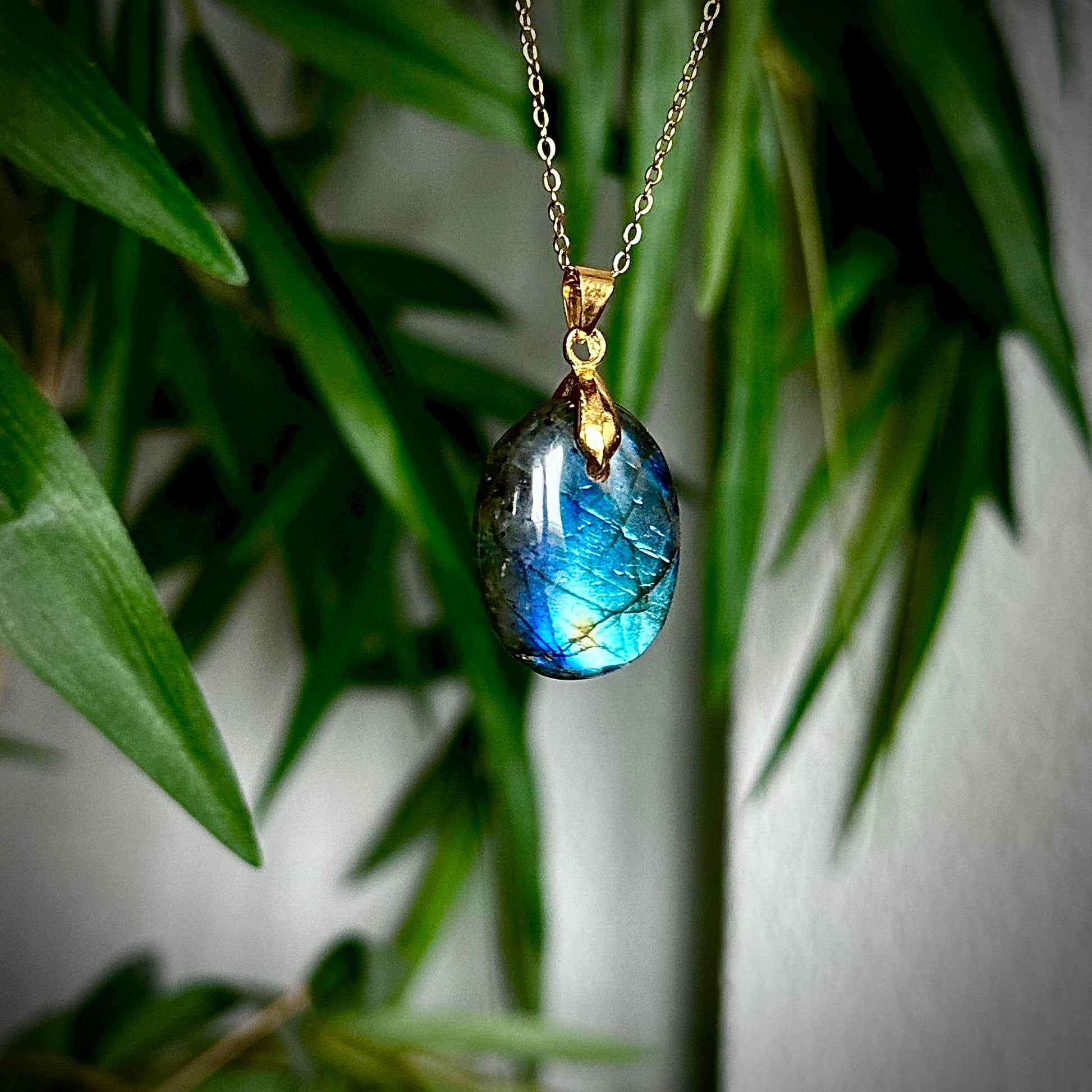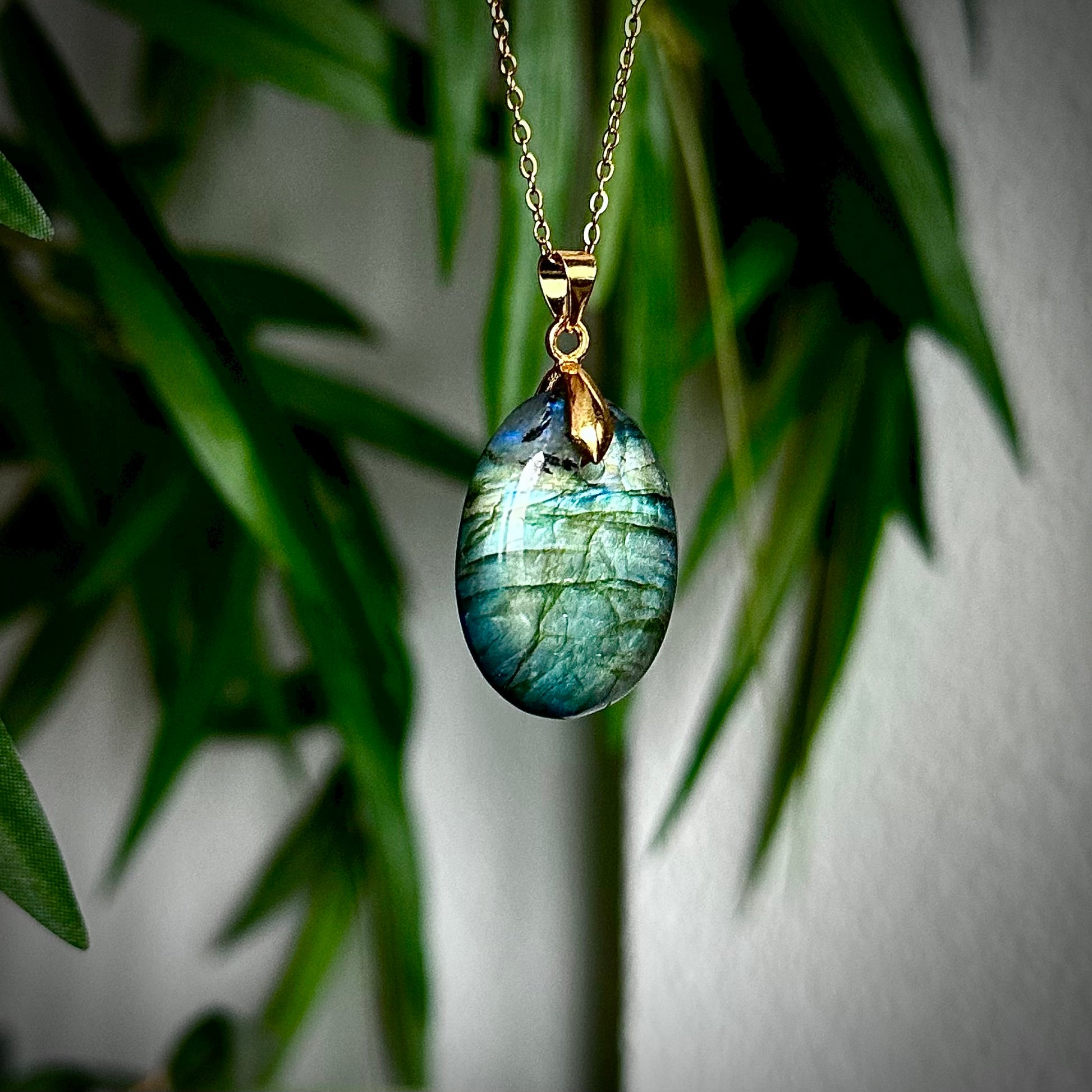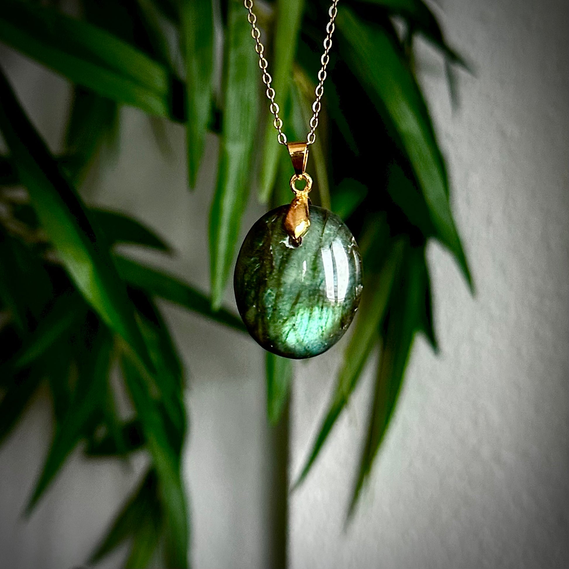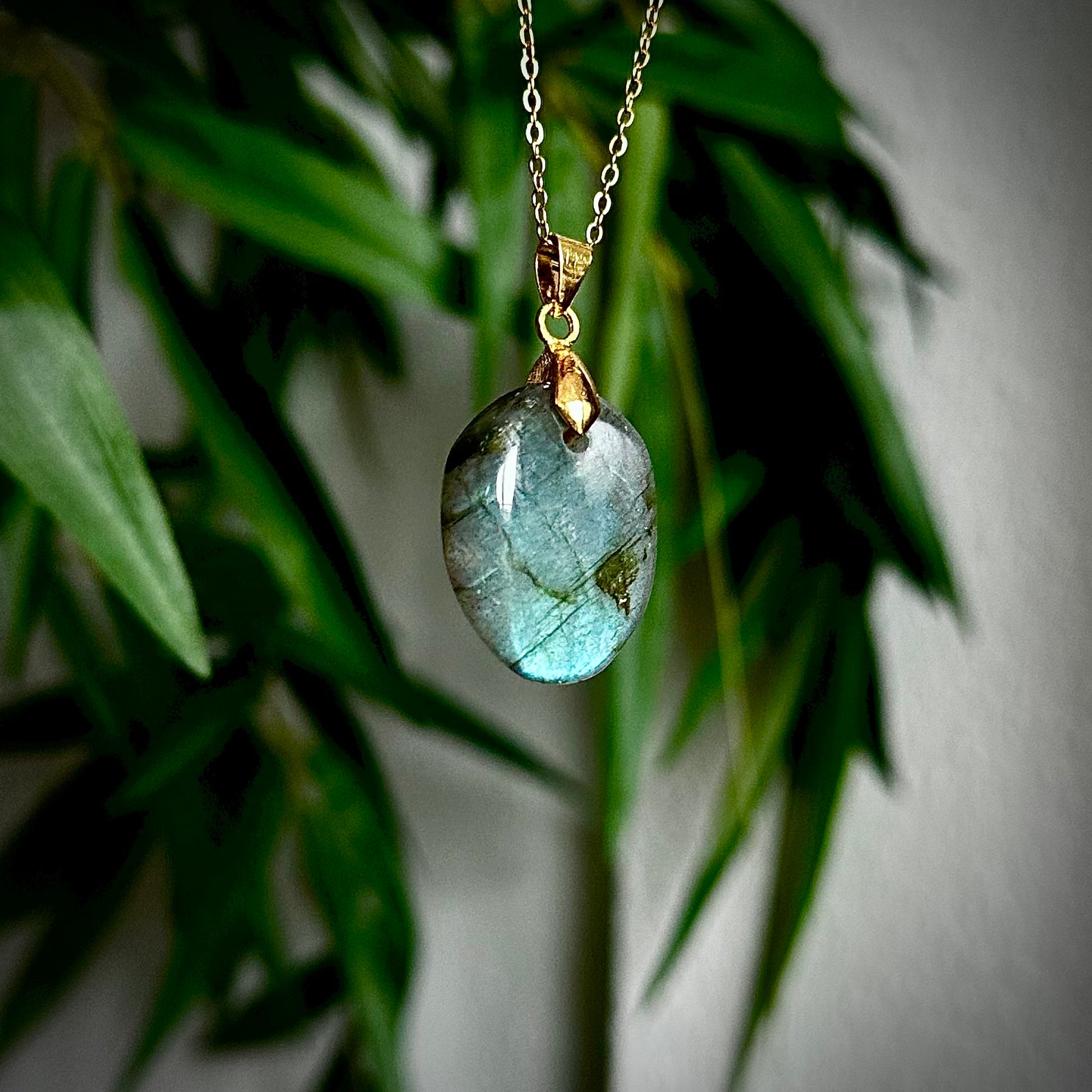 Labradoriet kettinghangers met een goudkleurig hangertje.