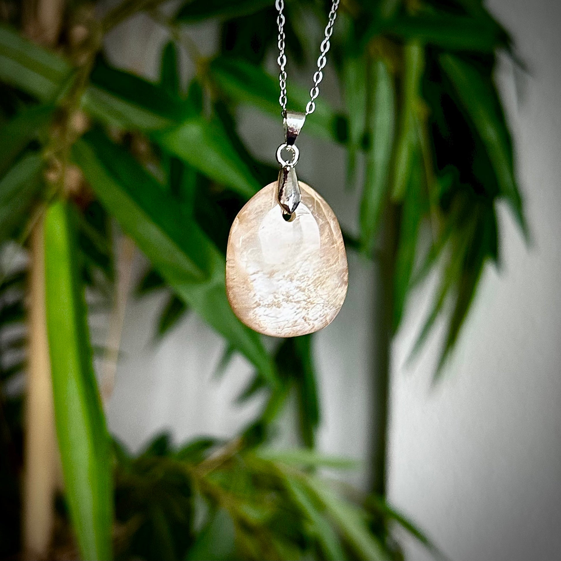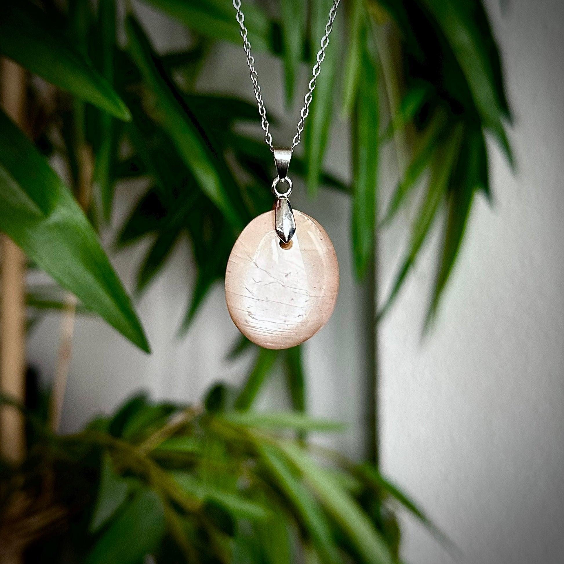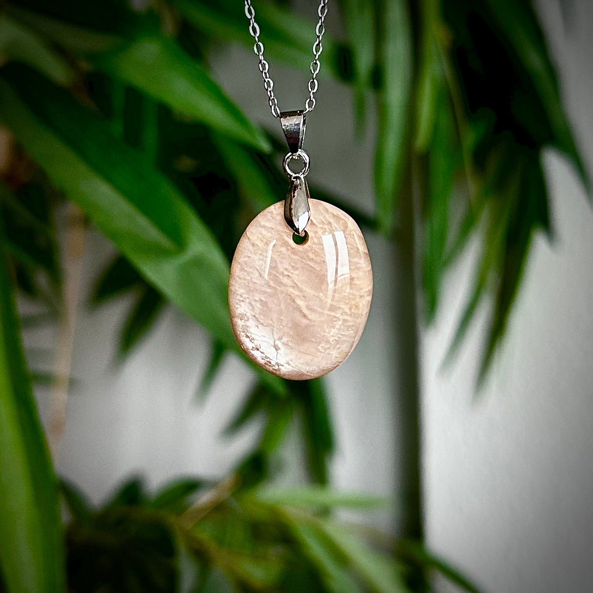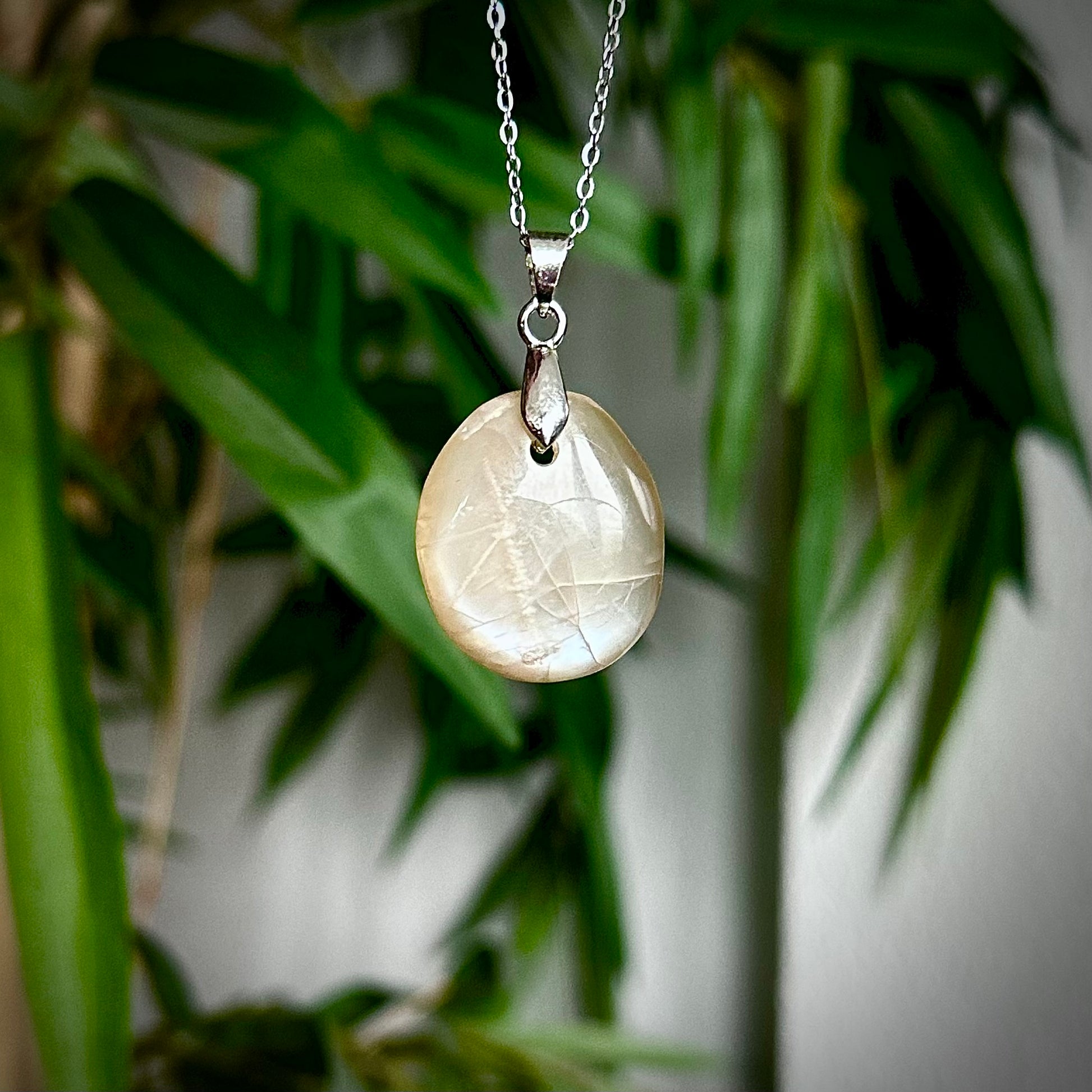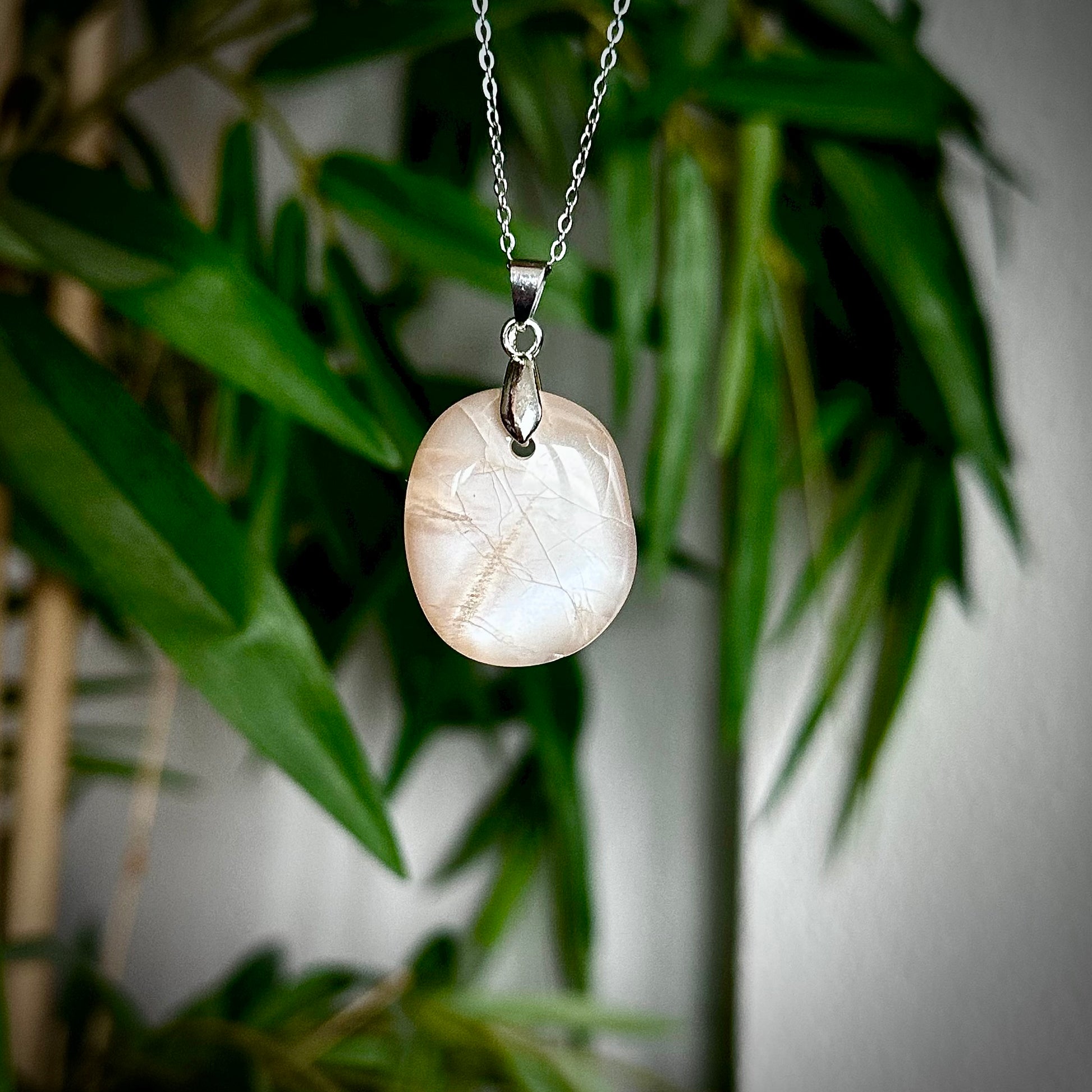 Lichte maansteen kettinghangers met een zilverkleurig hangertje.