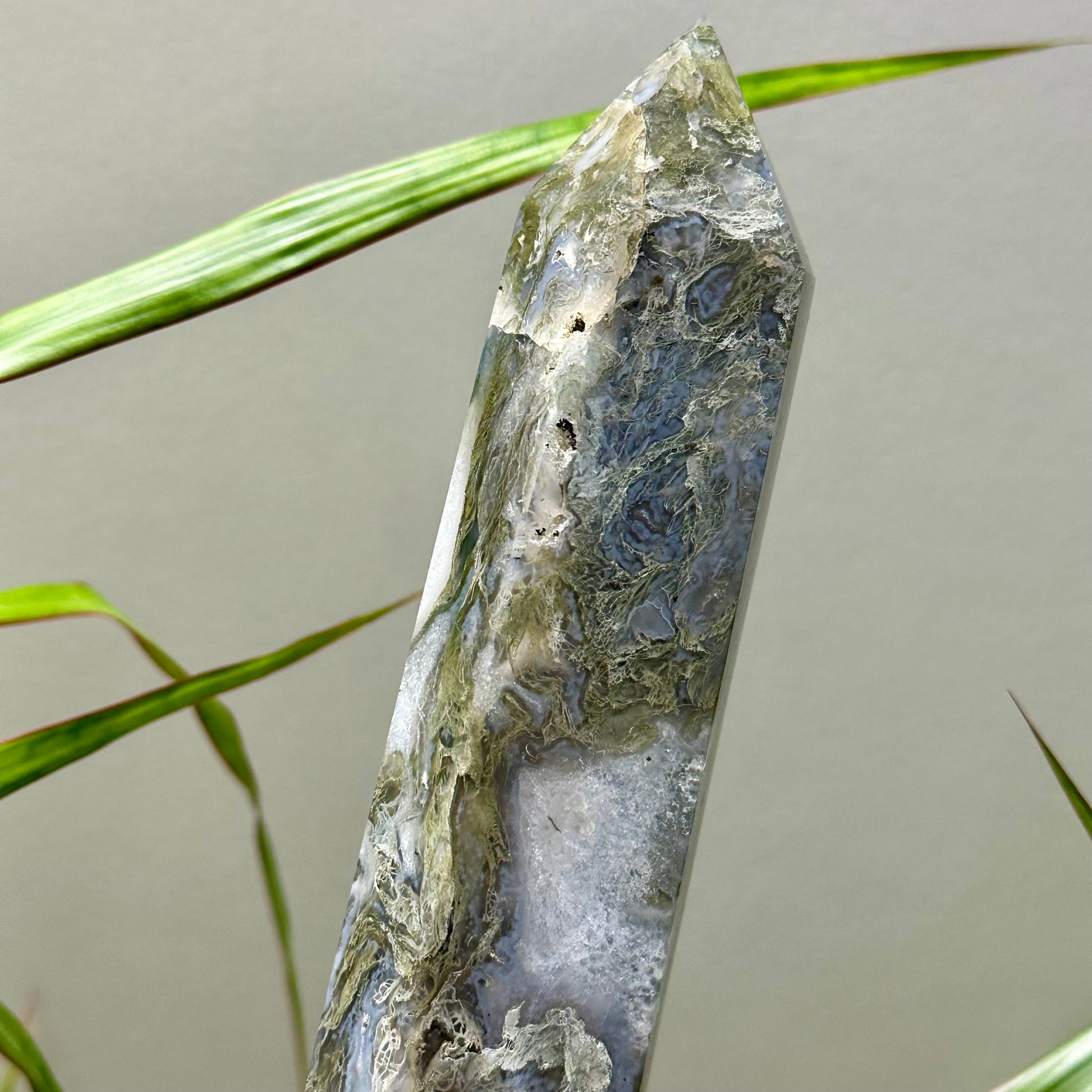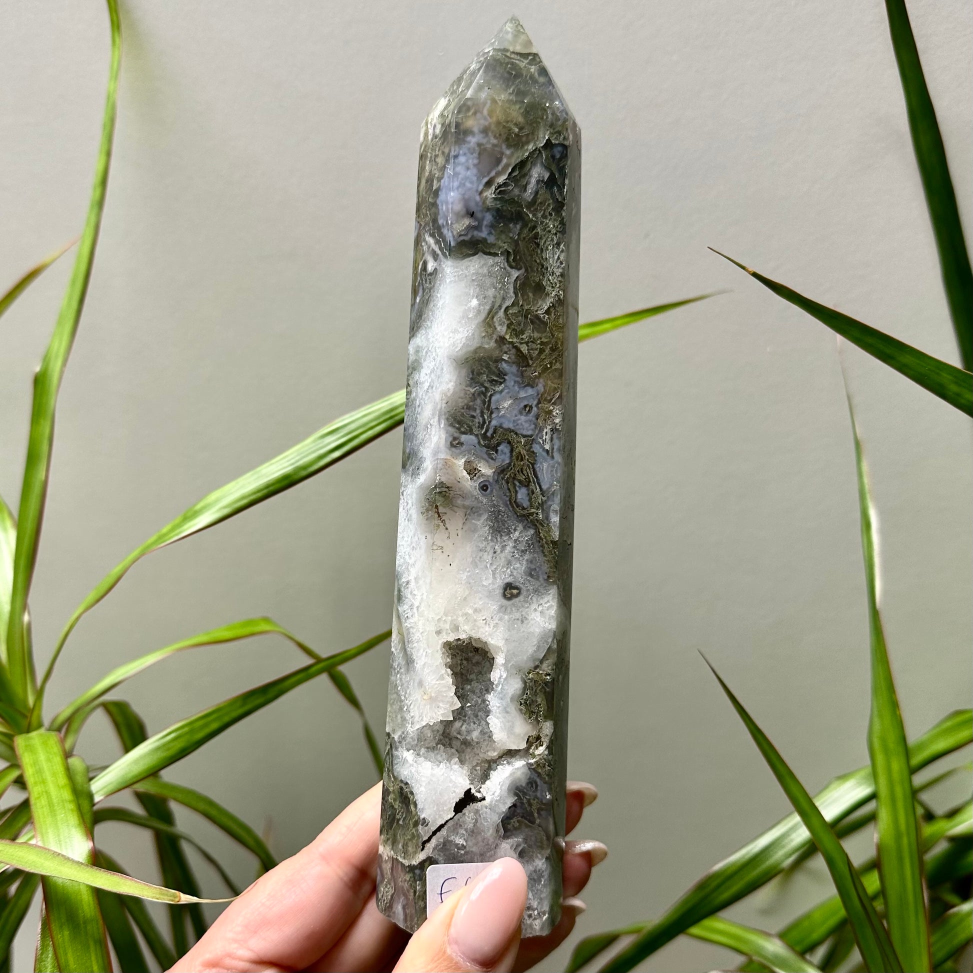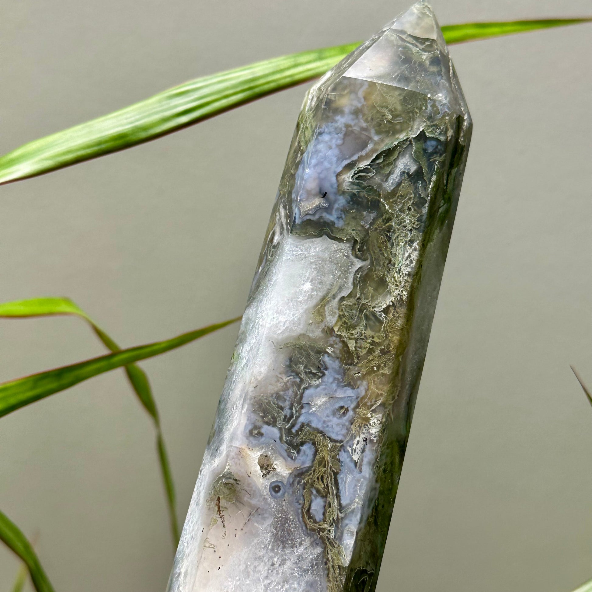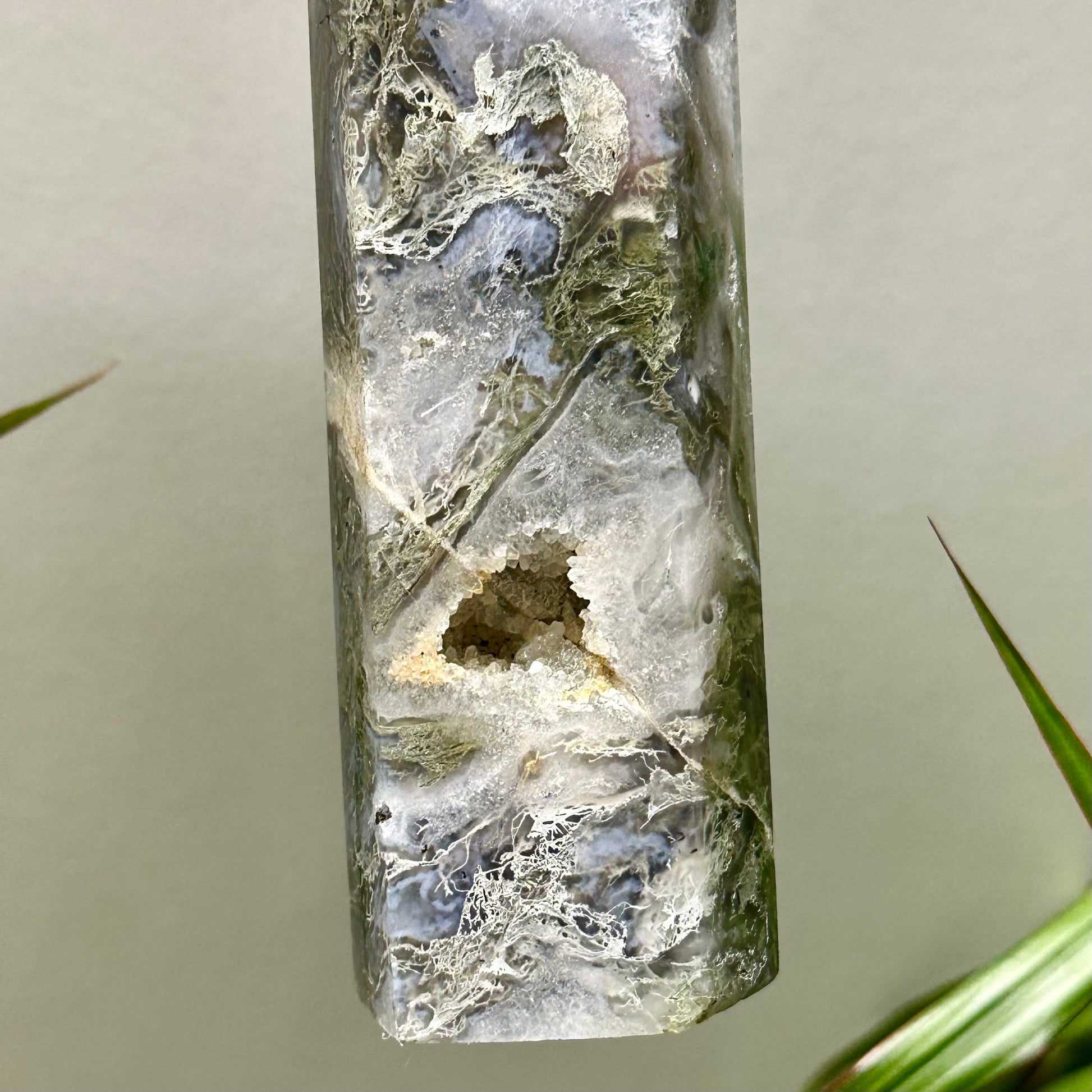 Prachtige, grote mosagaat toren. Deze toren heeft donker groene mospatronen met zelfs een beetje blauw, daarnaast ook stukken met meer wit (kwarts).