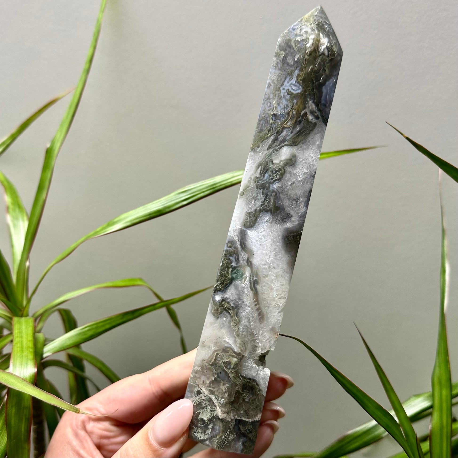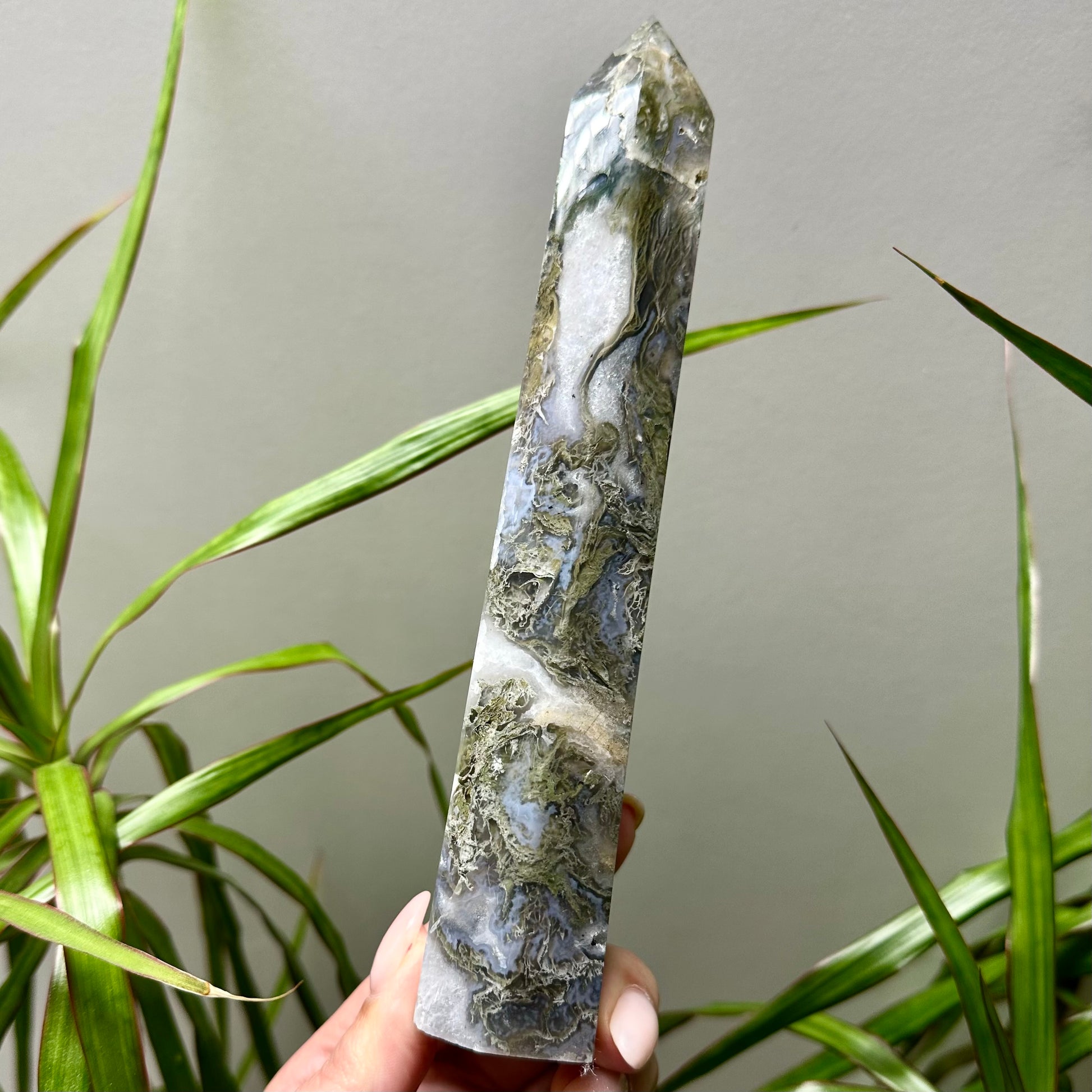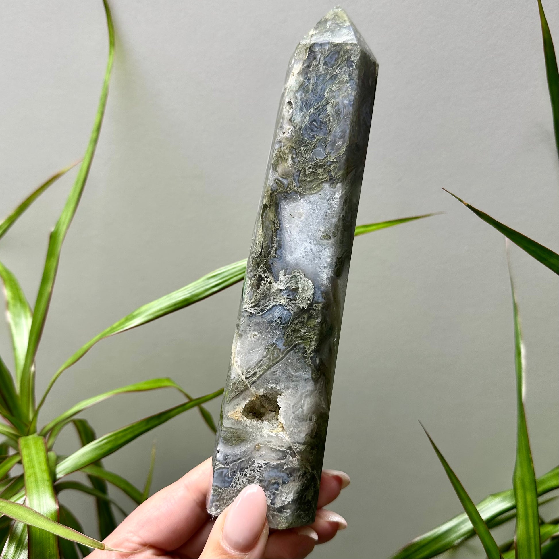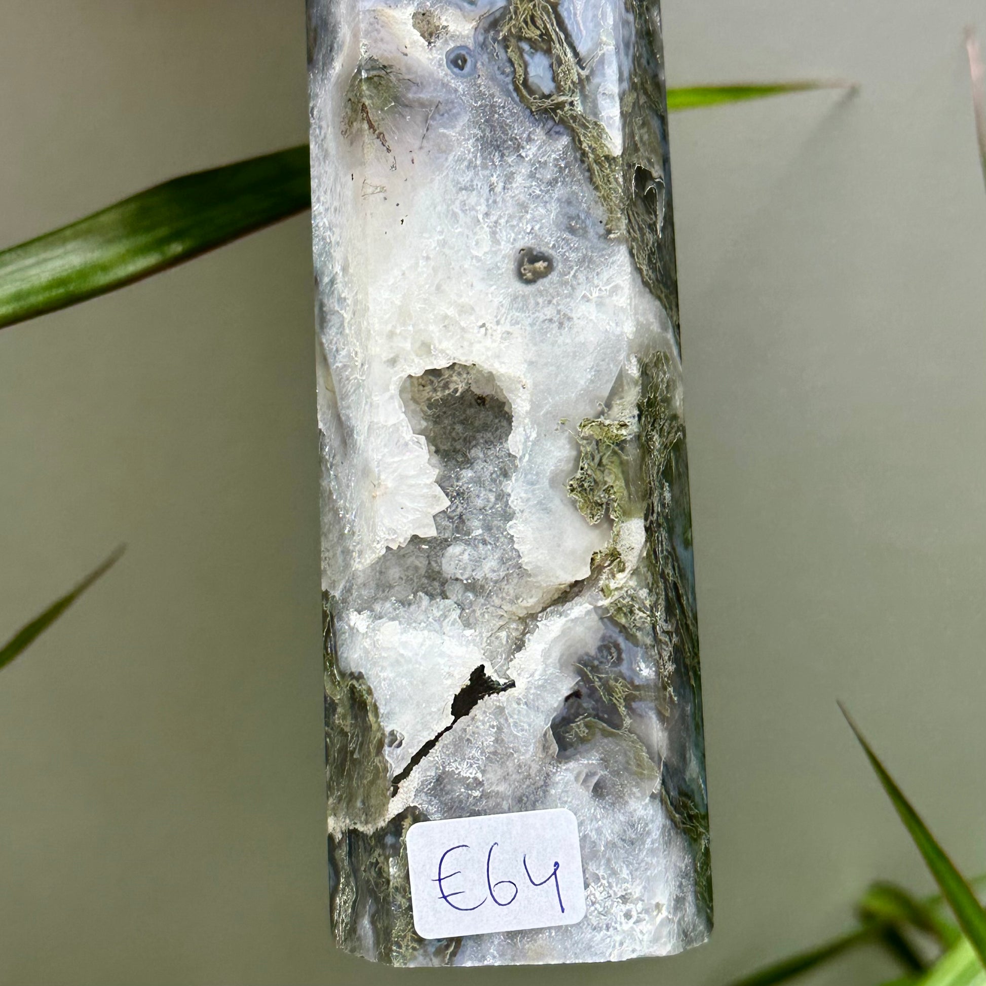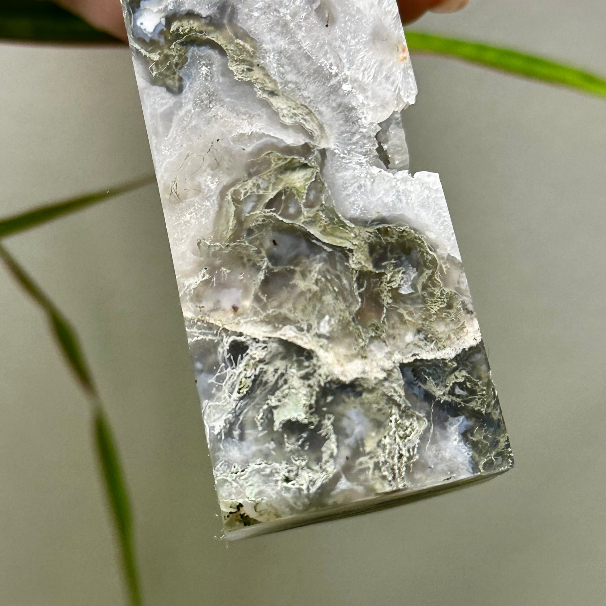 Prachtige, grote mosagaat toren. Deze toren heeft donker groene mospatronen met zelfs een beetje blauw, daarnaast ook stukken met meer wit (kwarts).