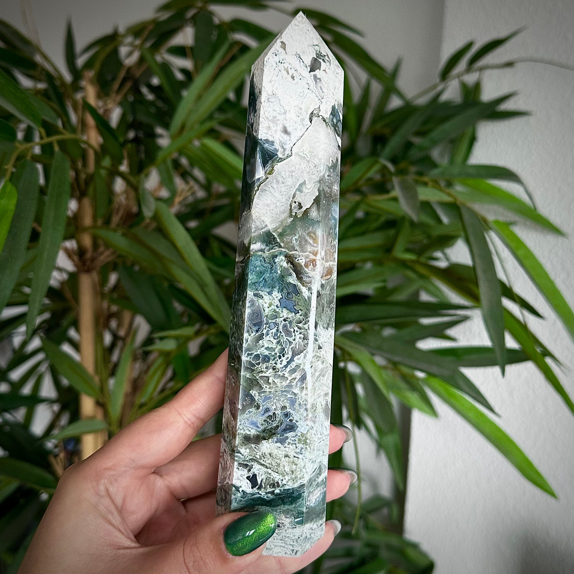 Prachtige, grote mosagaat toren met hele bijzondere patronen