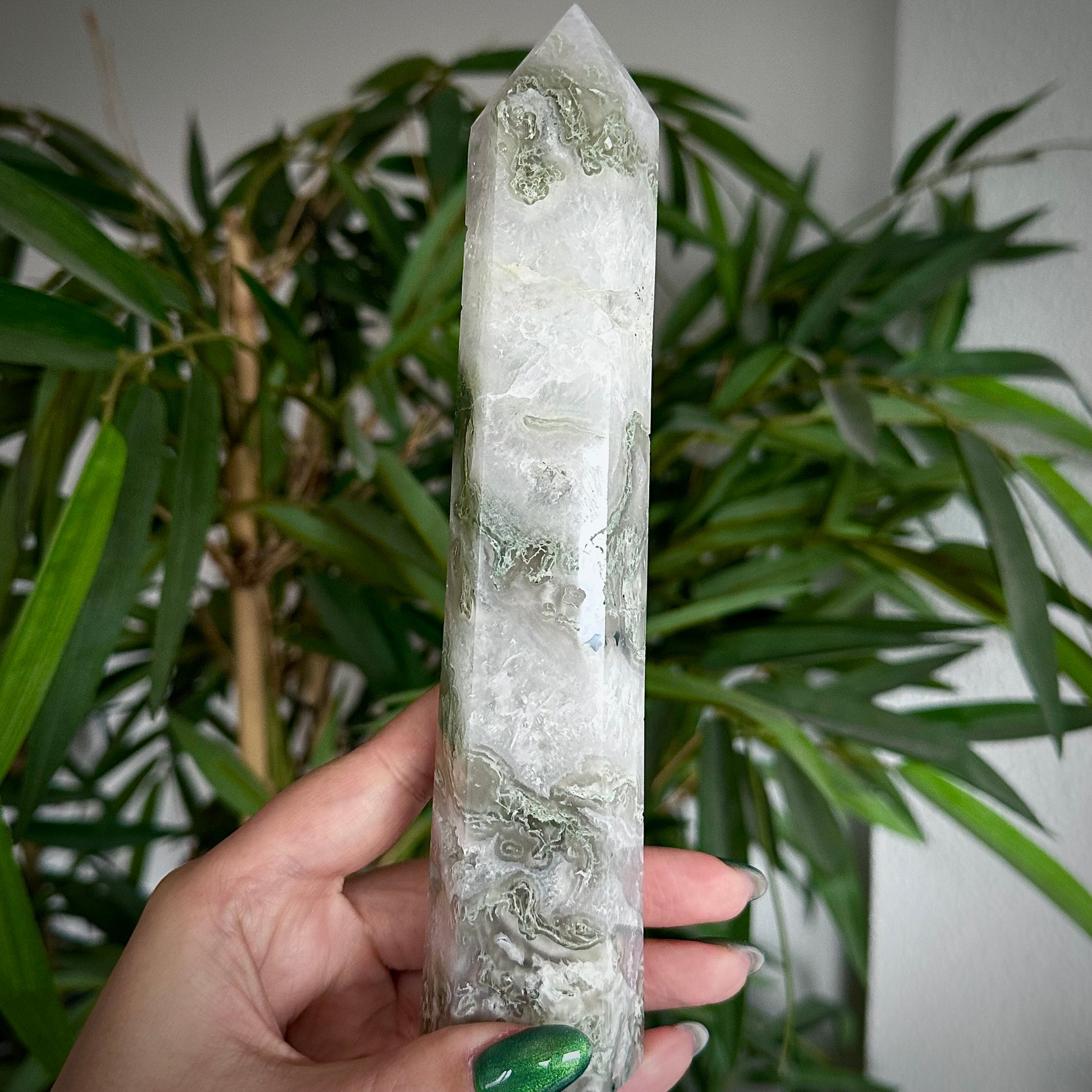 Prachtige, grote mosagaat toren met veel kwarts en licht groene patronen.