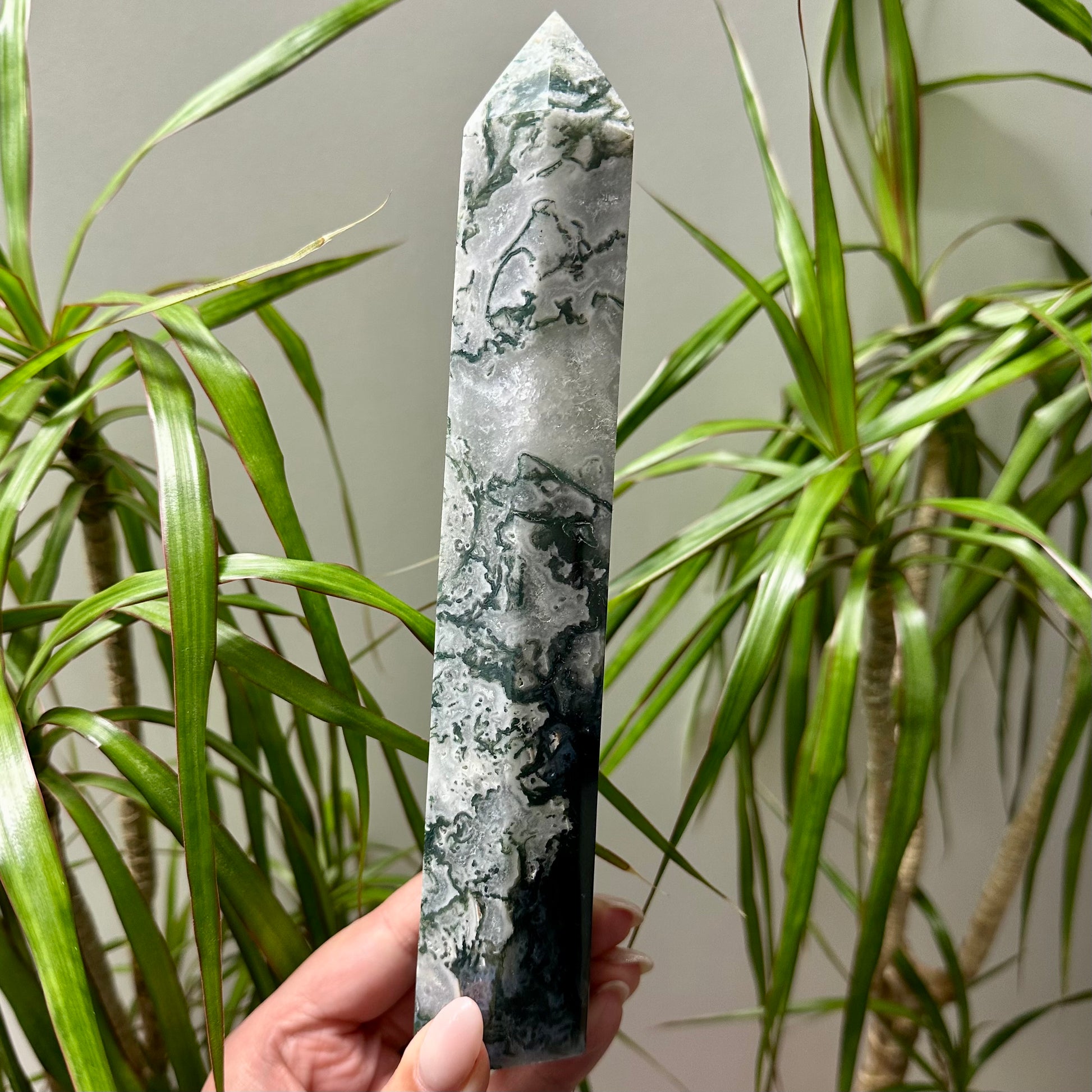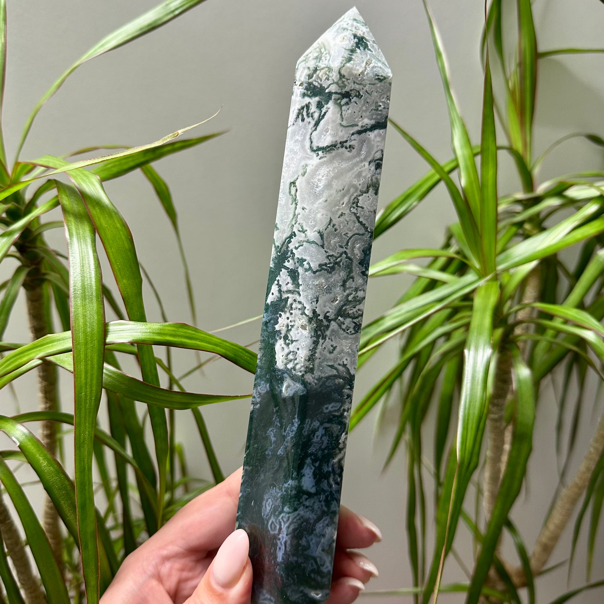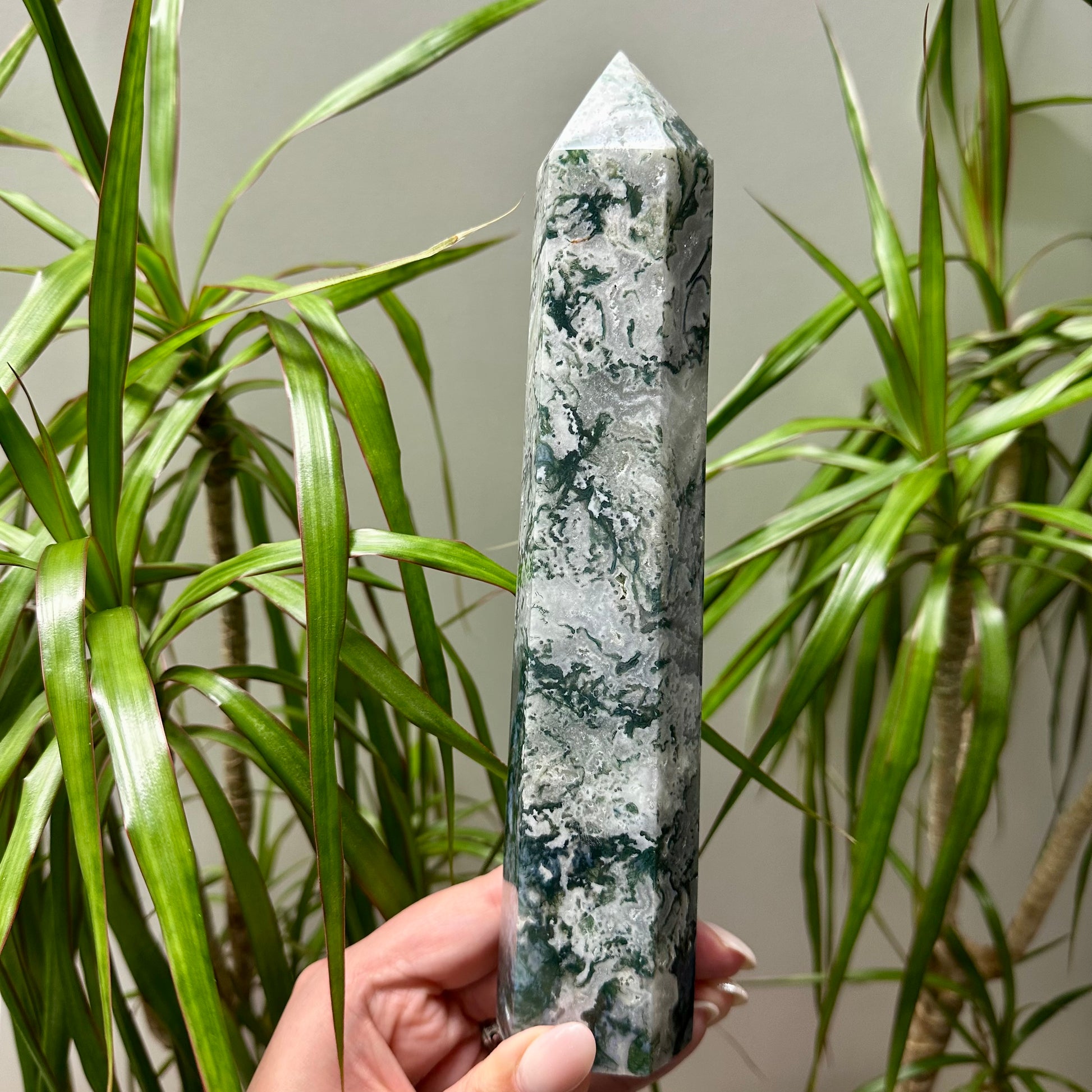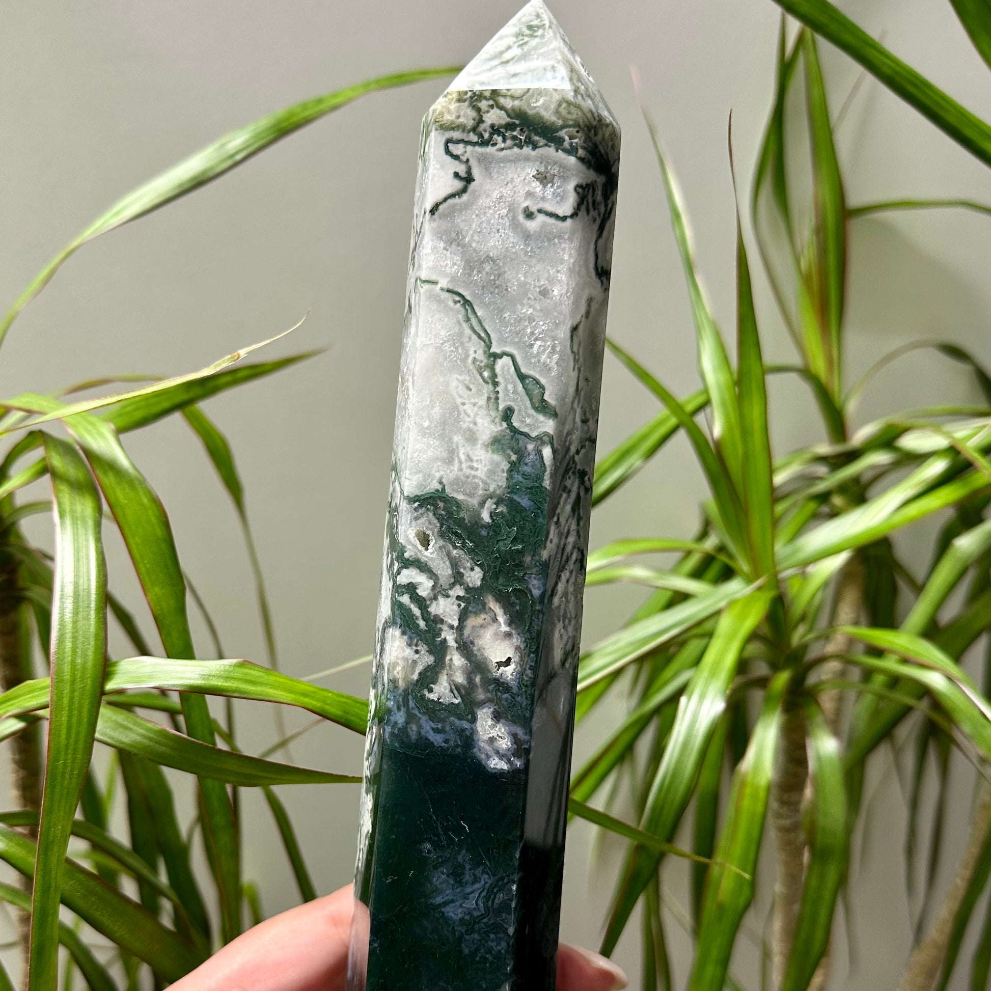 Prachtige, grote mosagaat toren. Deze toren heeft donker groene mospatronen met zelfs een beetje blauw en rood, daarnaast ook stukken met meer wit (kwarts).
