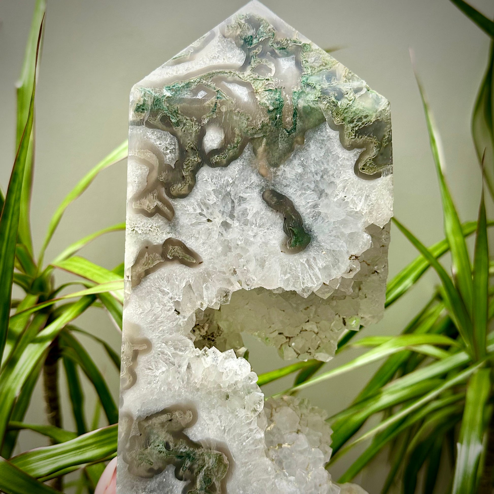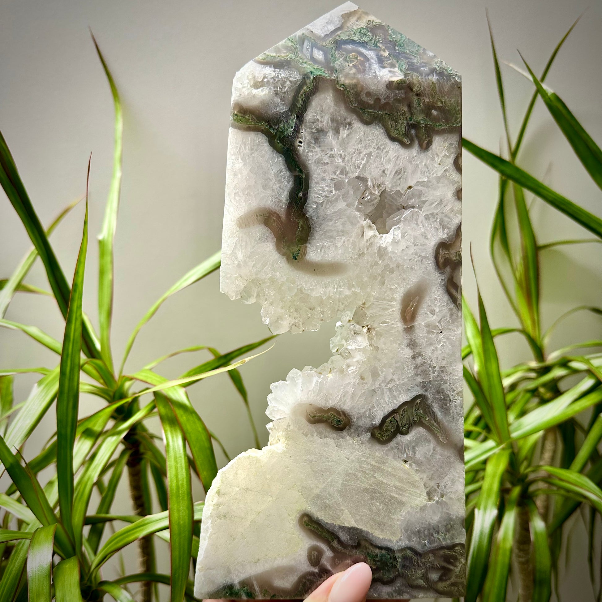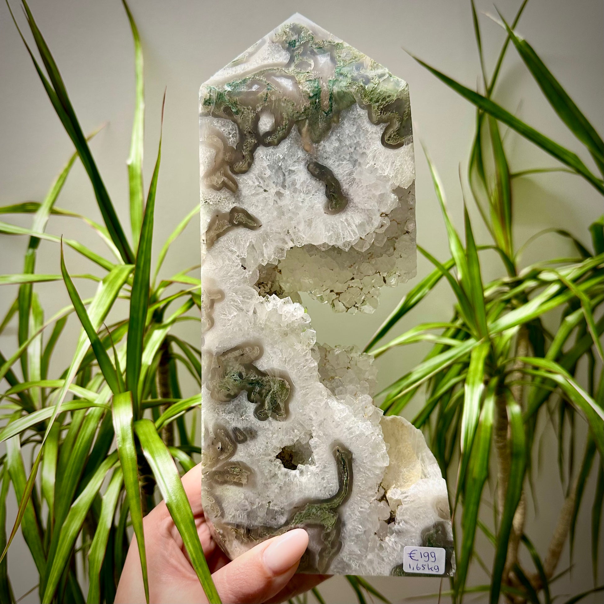 Prachtige, grote mosagaat toren. Deze toren is niet alleen hoog, maar ook nog erg breed. Hij heeft een opening met allemaal mooie kwartspuntjes. Aan de onderzijde van de opening zit ook nog een calciet met regenboogjes.
