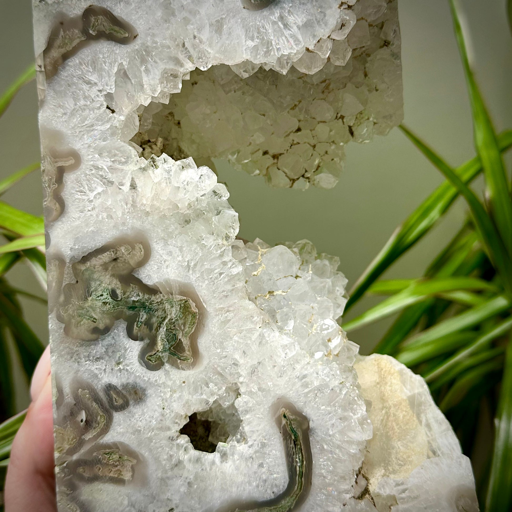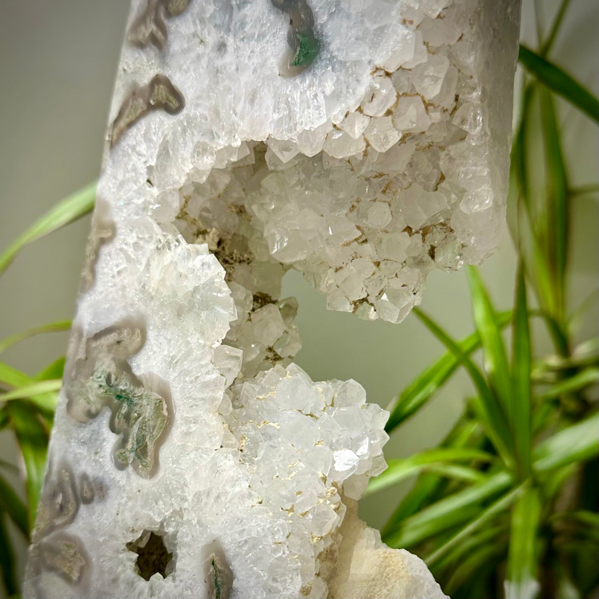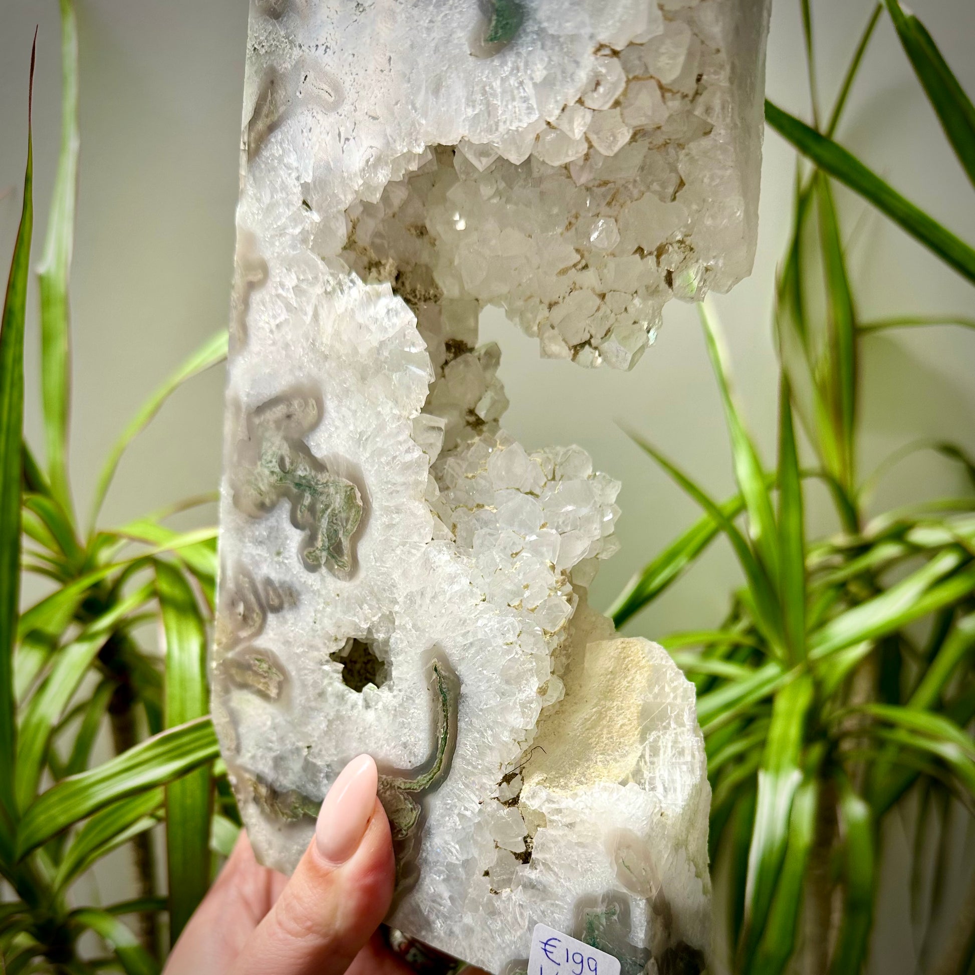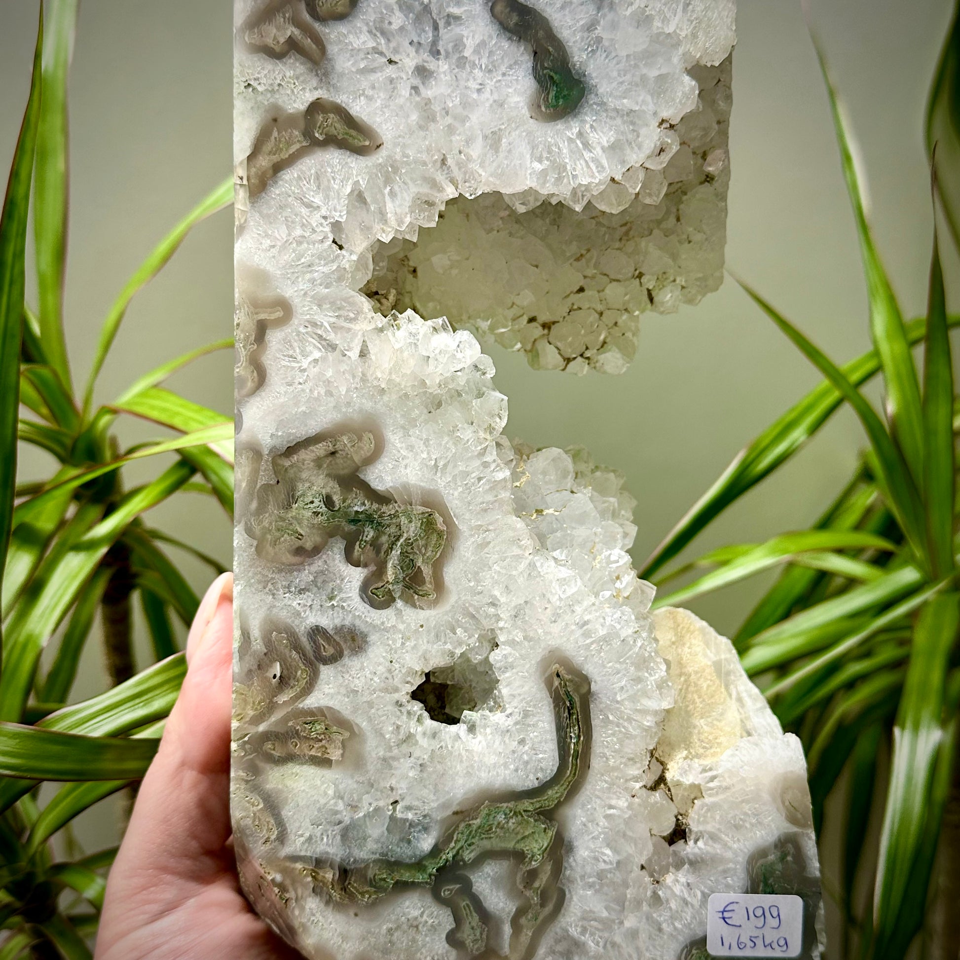 Prachtige, grote mosagaat toren. Deze toren is niet alleen hoog, maar ook nog erg breed. Hij heeft een opening met allemaal mooie kwartspuntjes. Aan de onderzijde van de opening zit ook nog een calciet met regenboogjes.