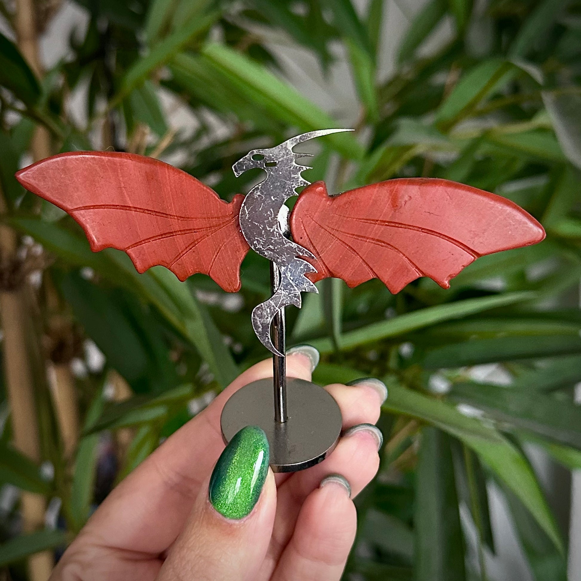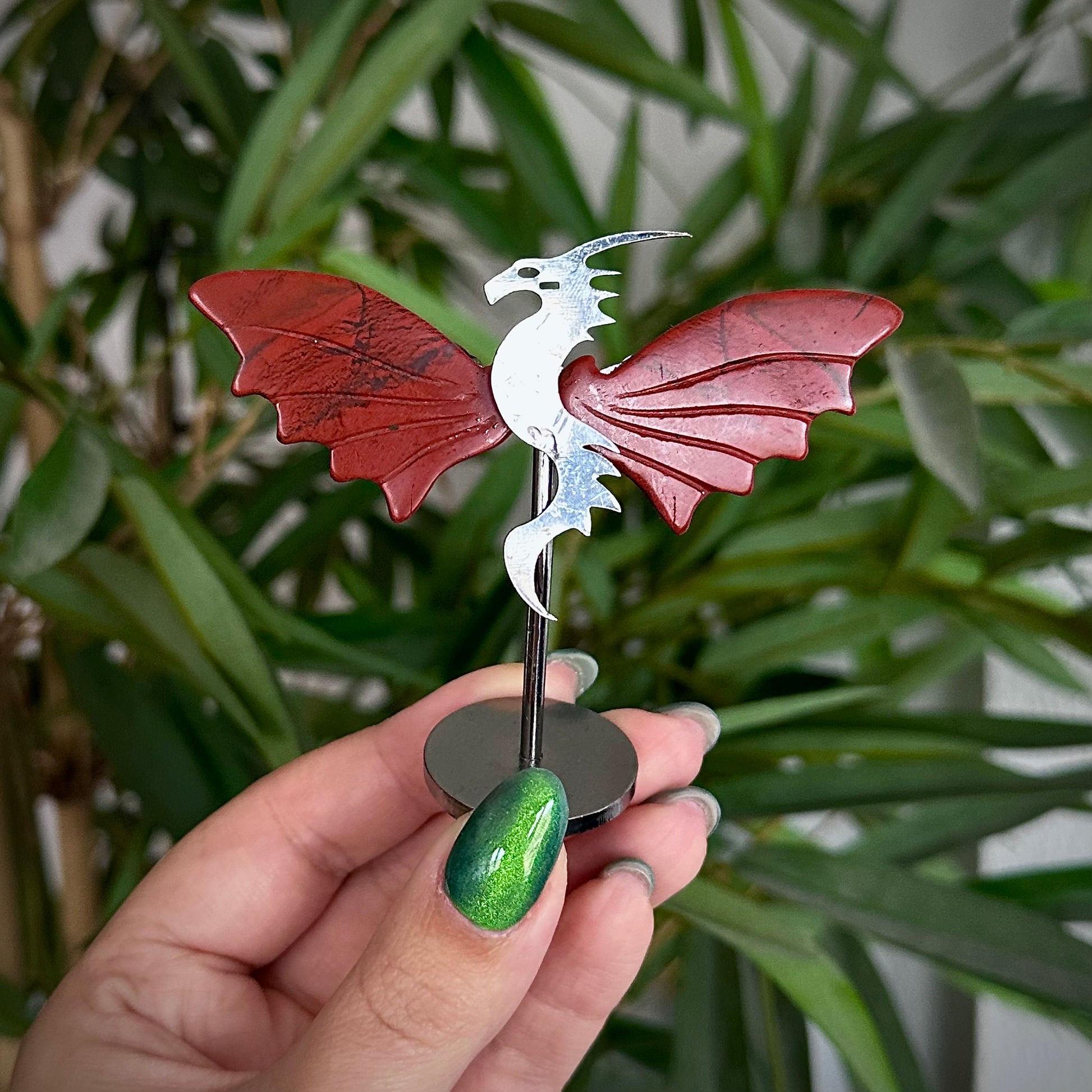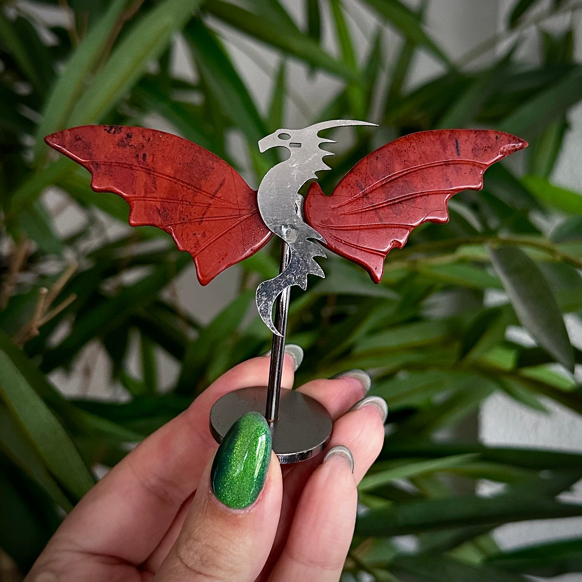 Draakjes van rode jaspis op metalen standaard.