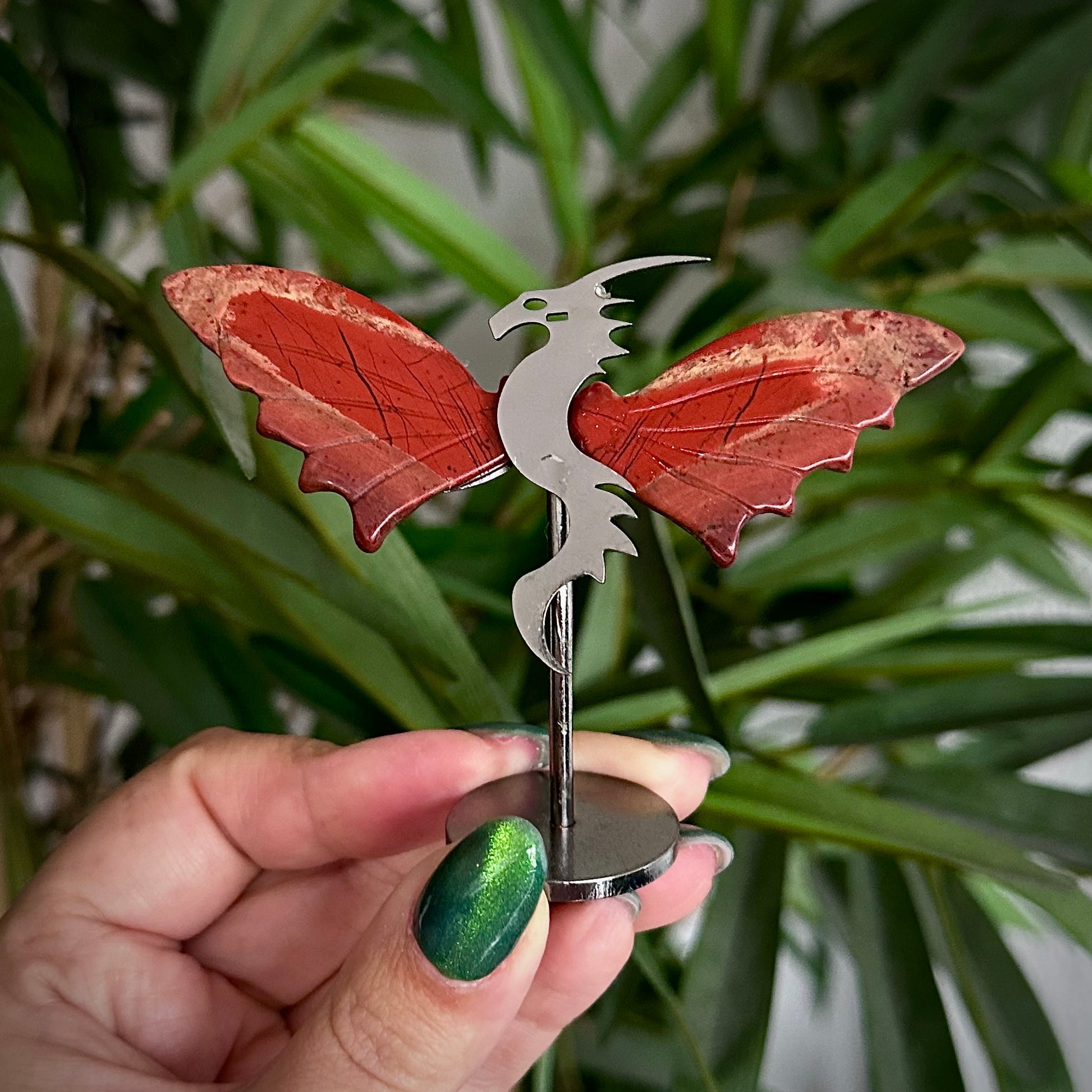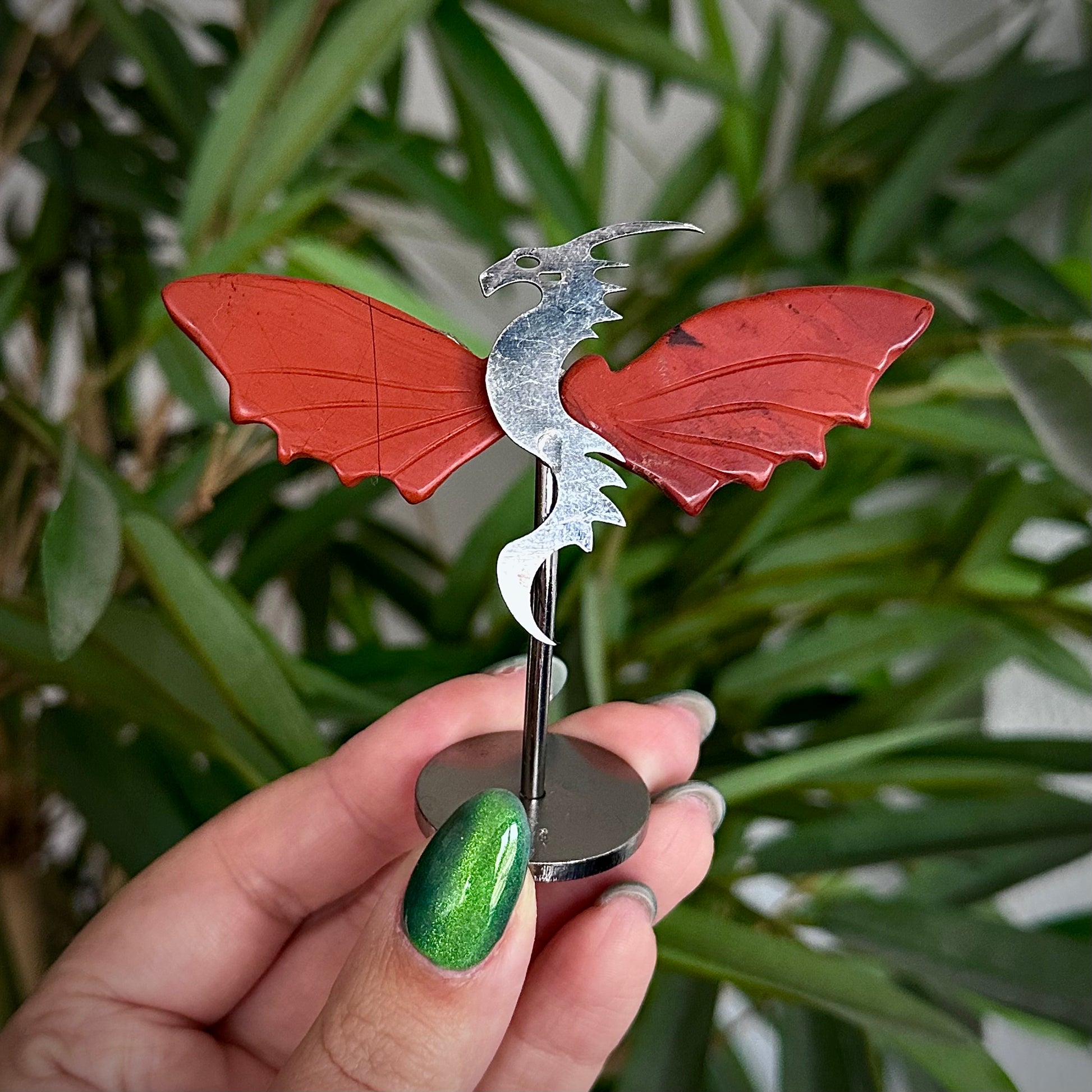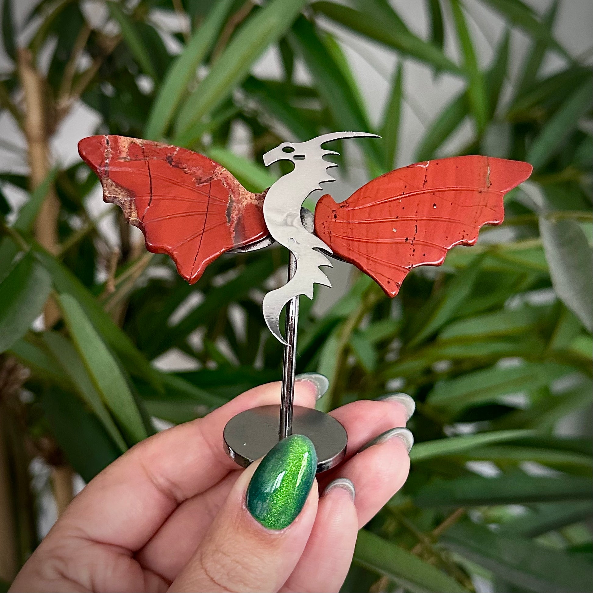 Draakjes van rode jaspis op metalen standaard.