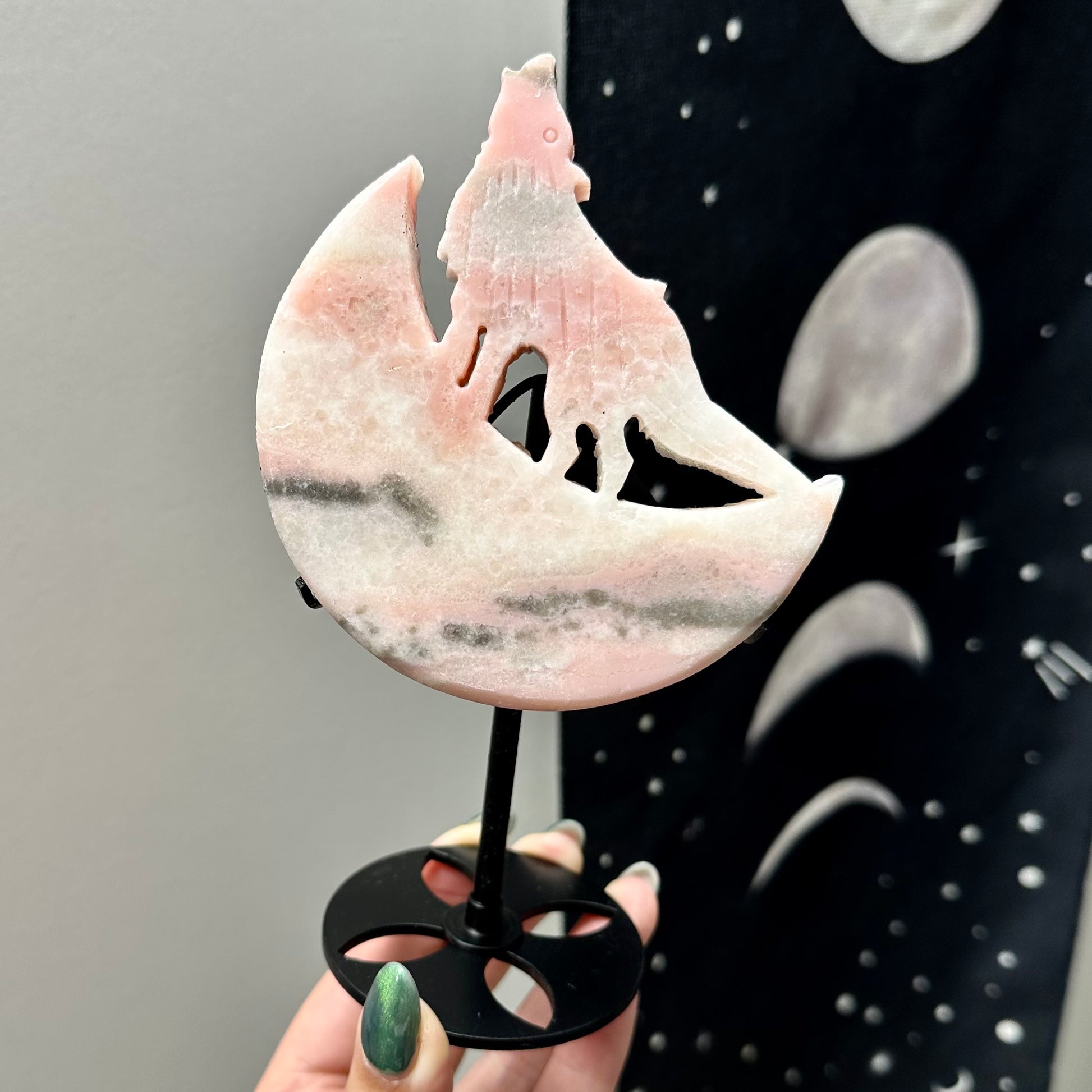 Huilende wolf op maan van roze Andes opaal inclusief standaard.