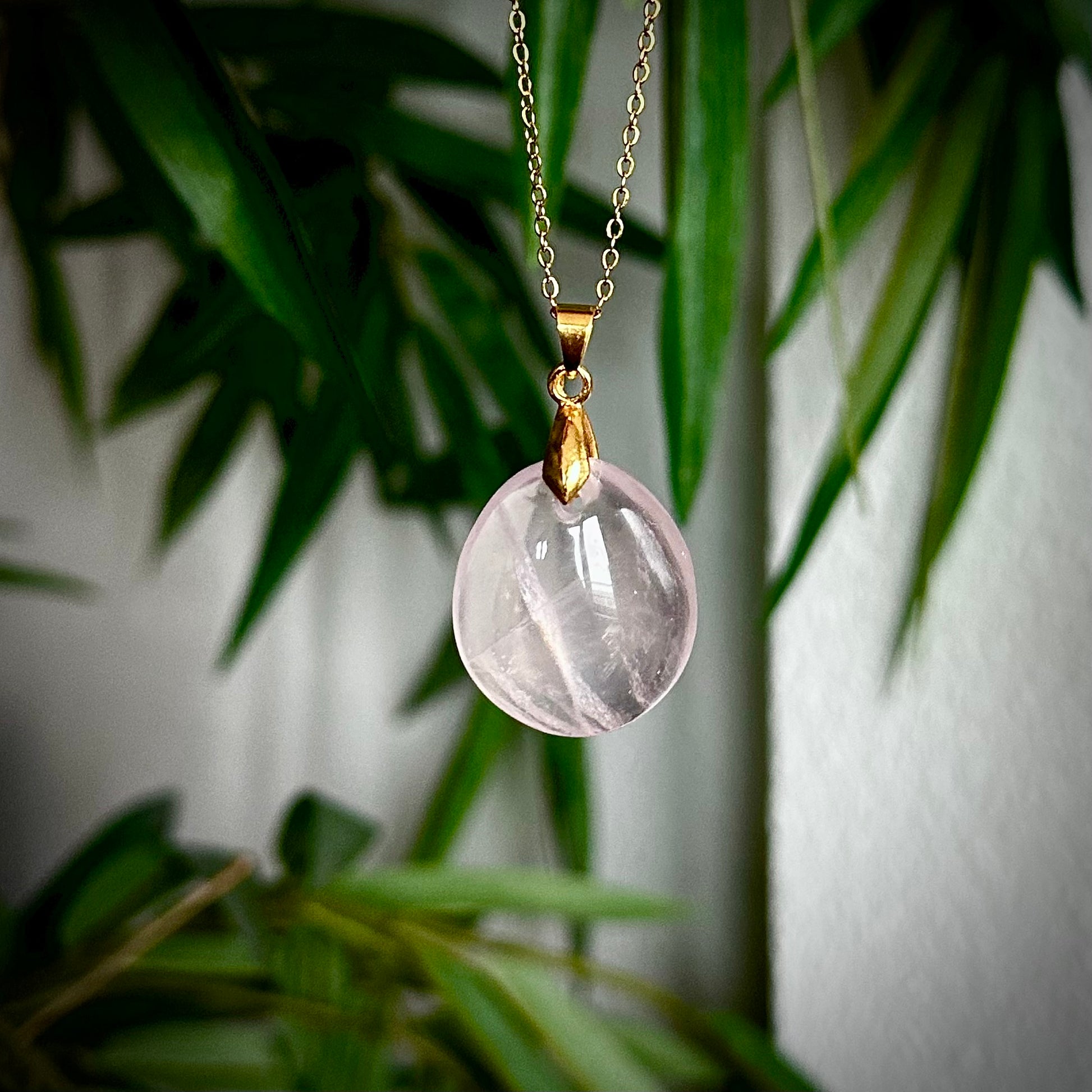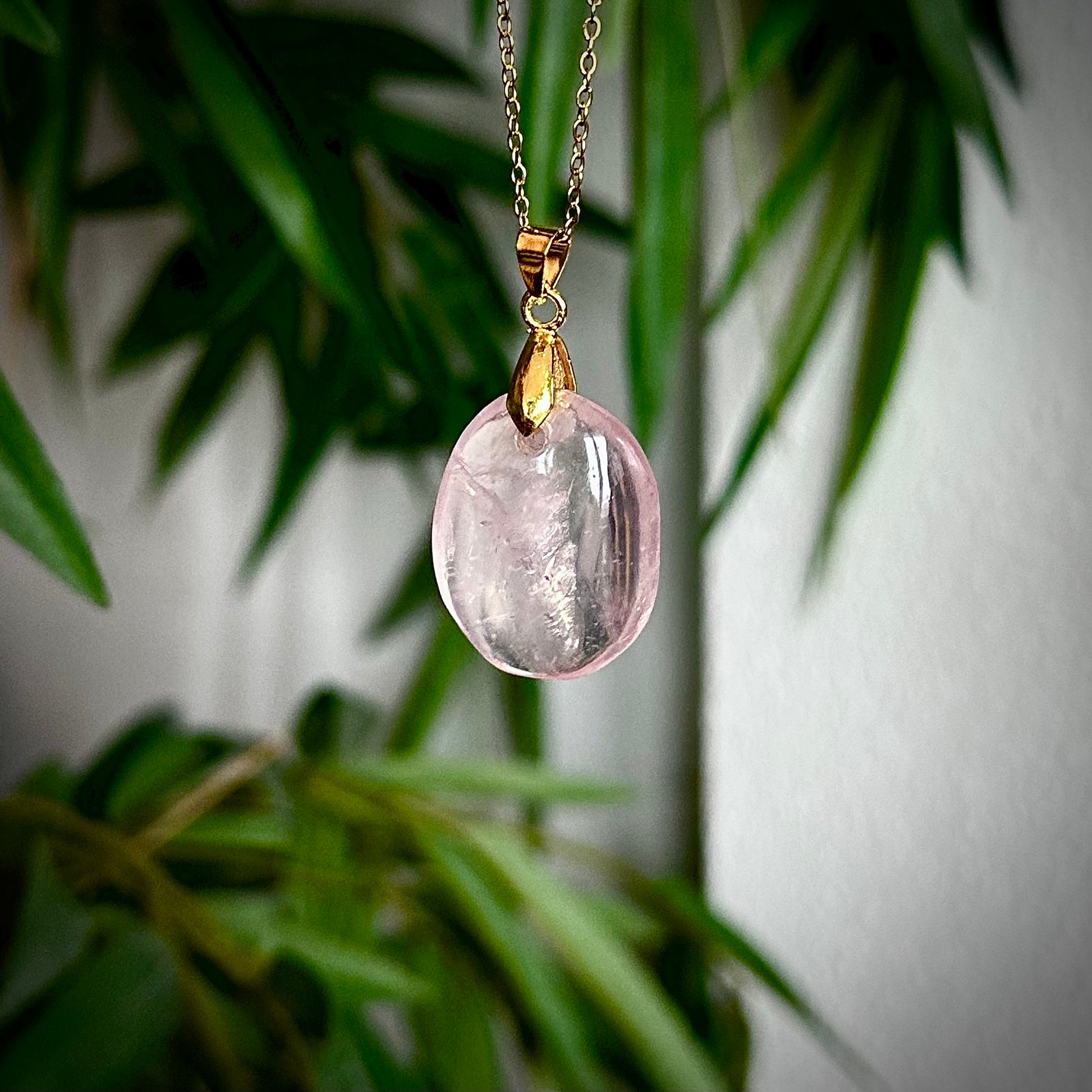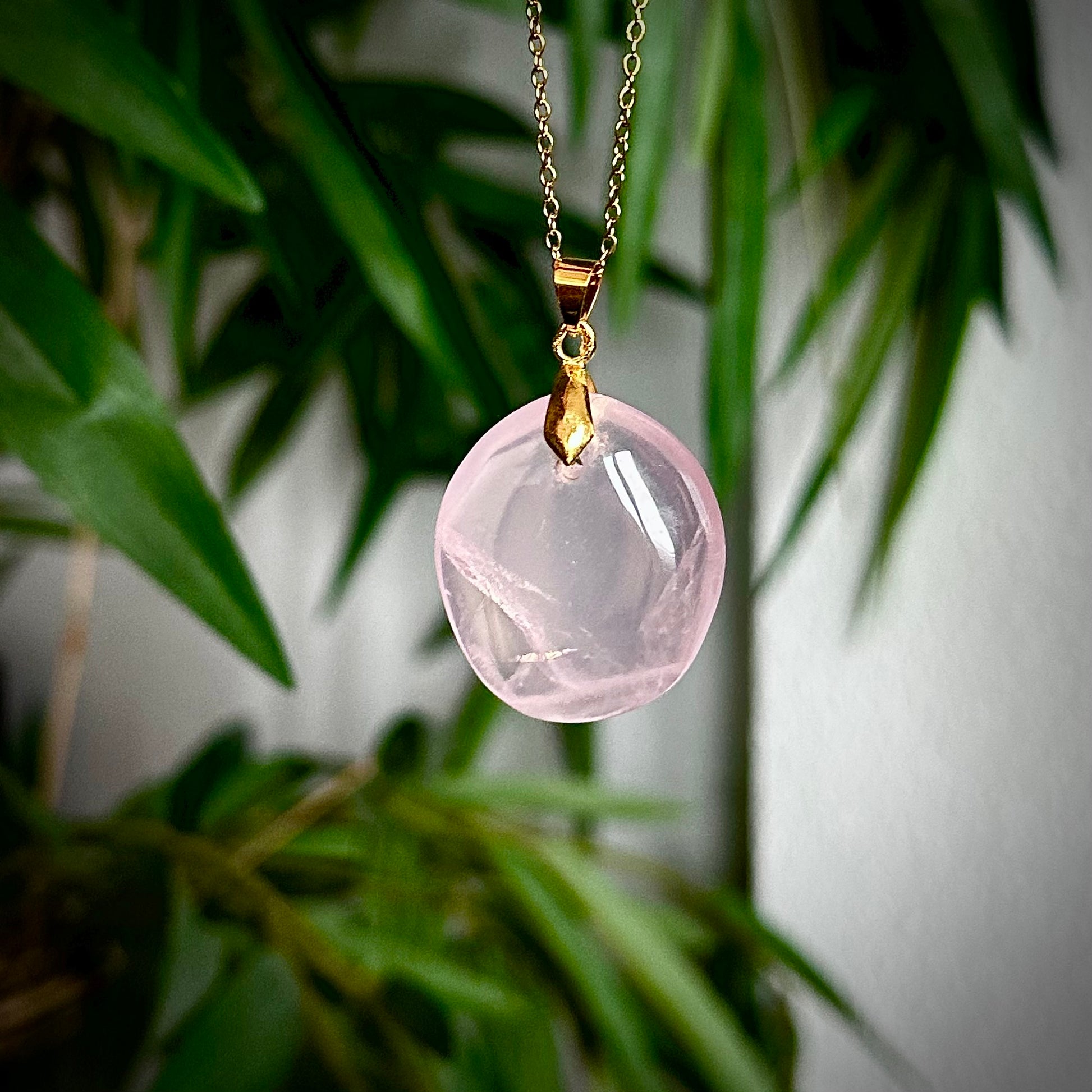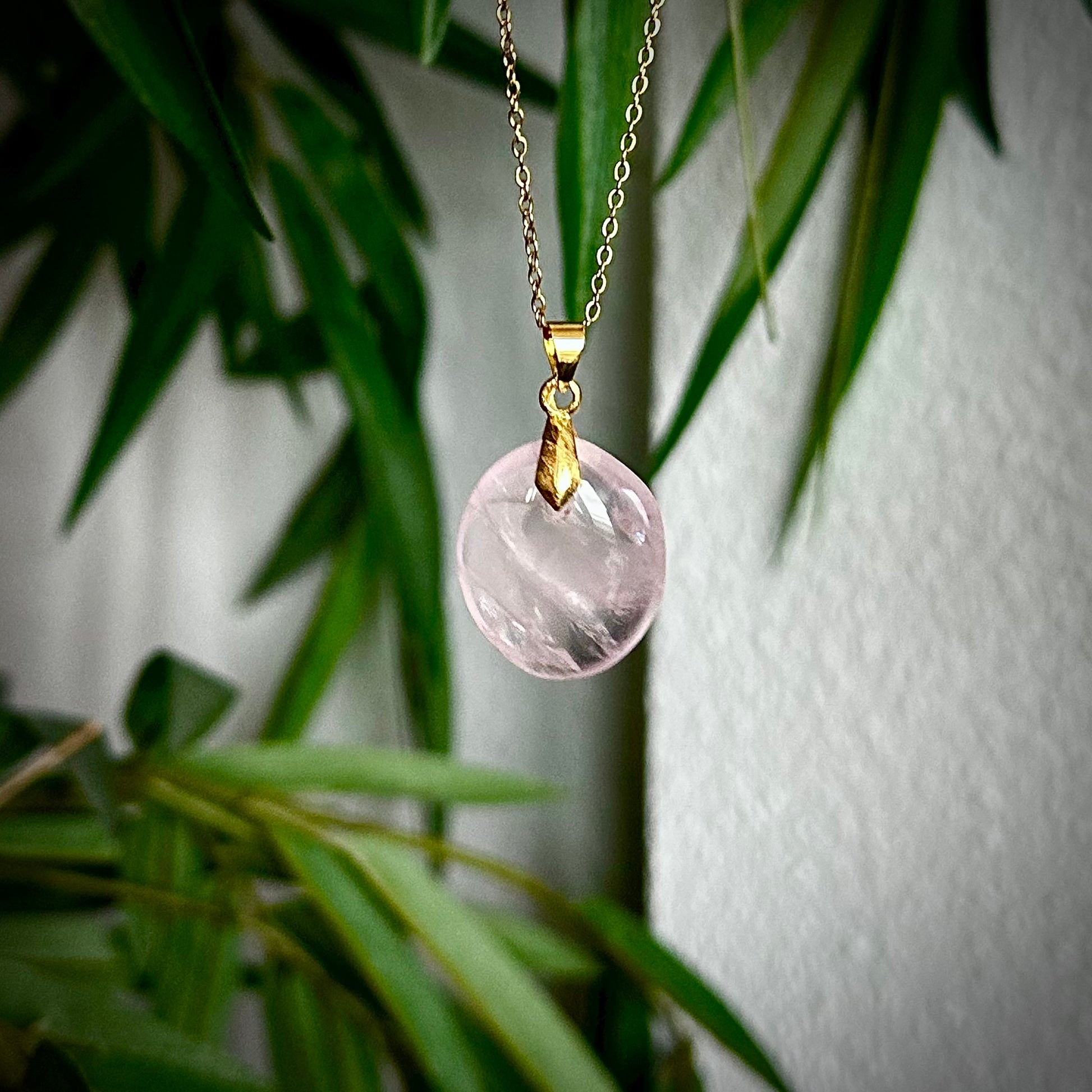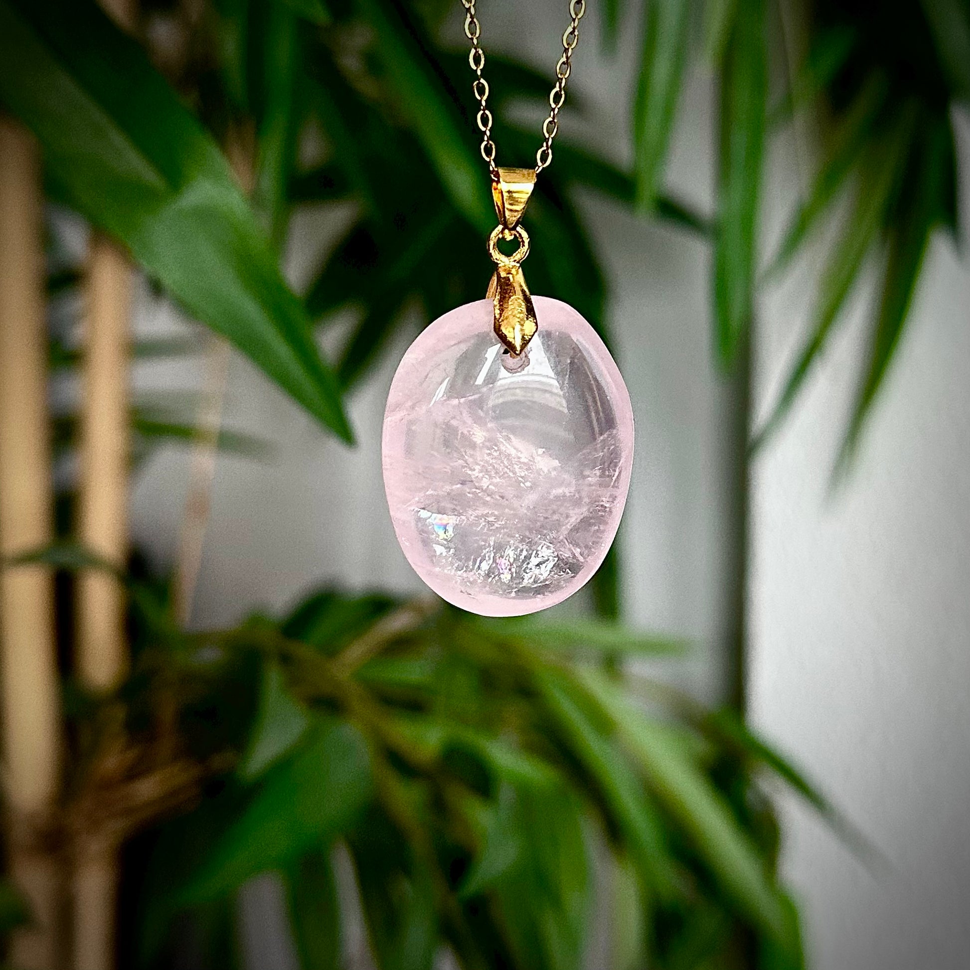 Rozenkwarts kettinghangers met een goudkleurig hangertje.