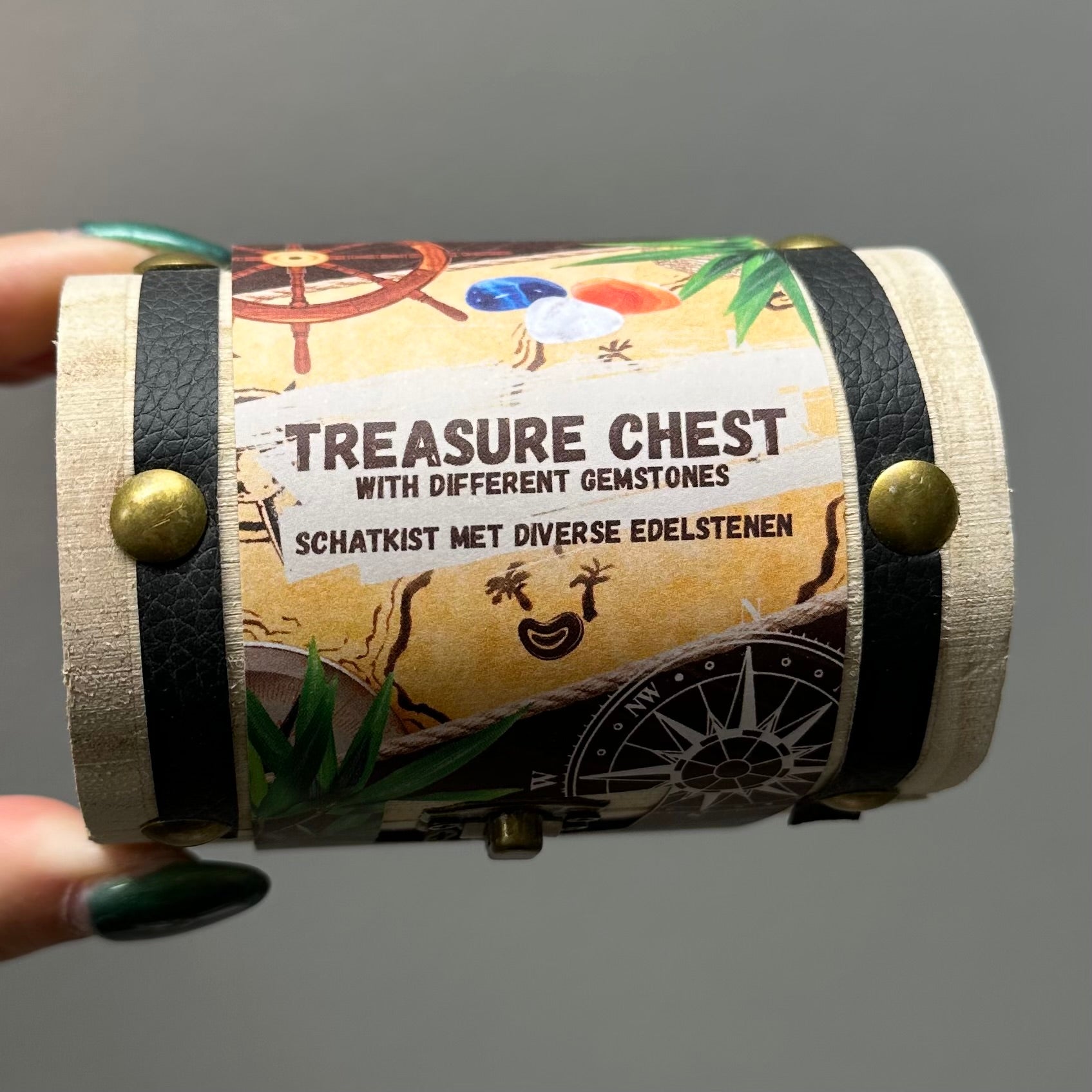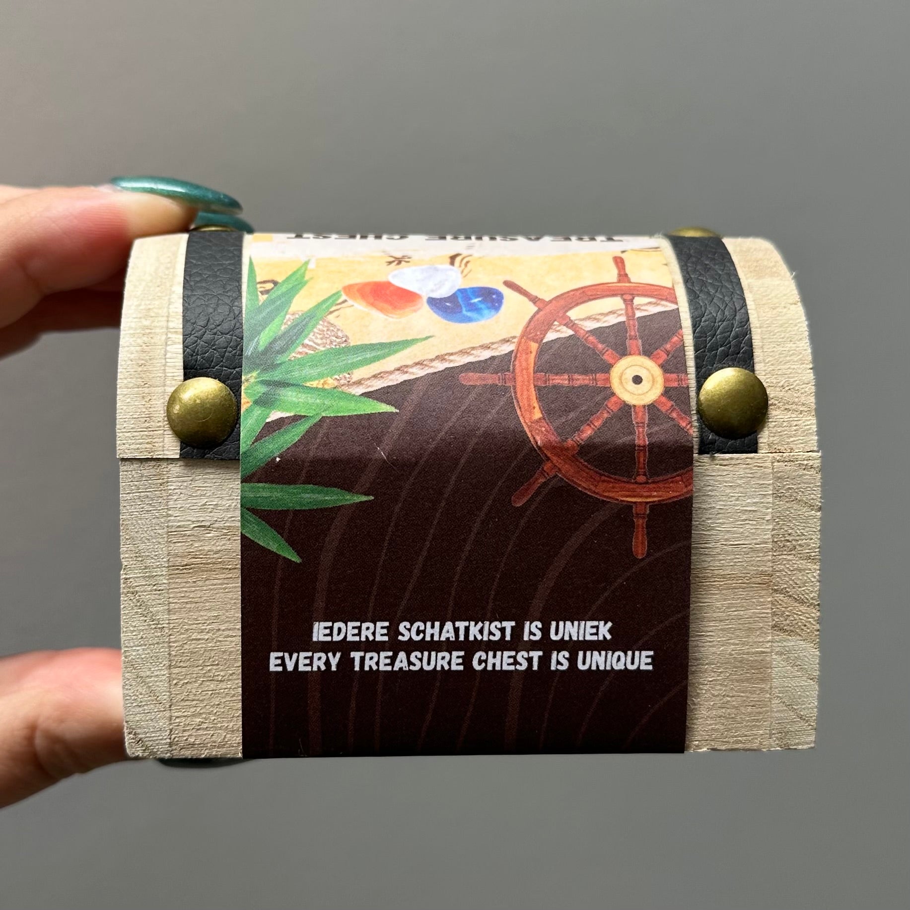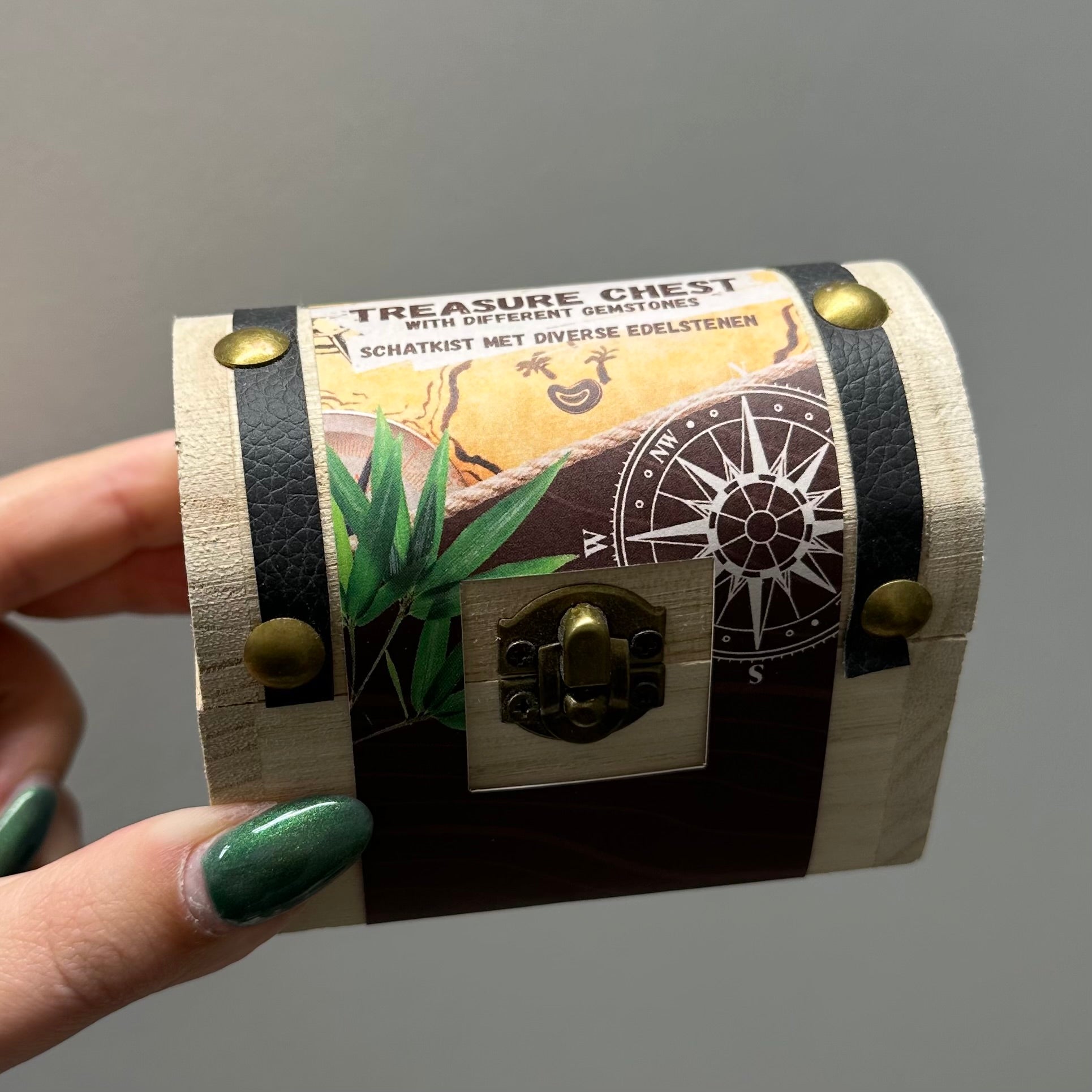 Elk schatkistje bevat minimaal 250 gram aan trommelstenen. De stenen variëren in grootte. Elk schatkistje is anders. Foto is ter voorbeeld.