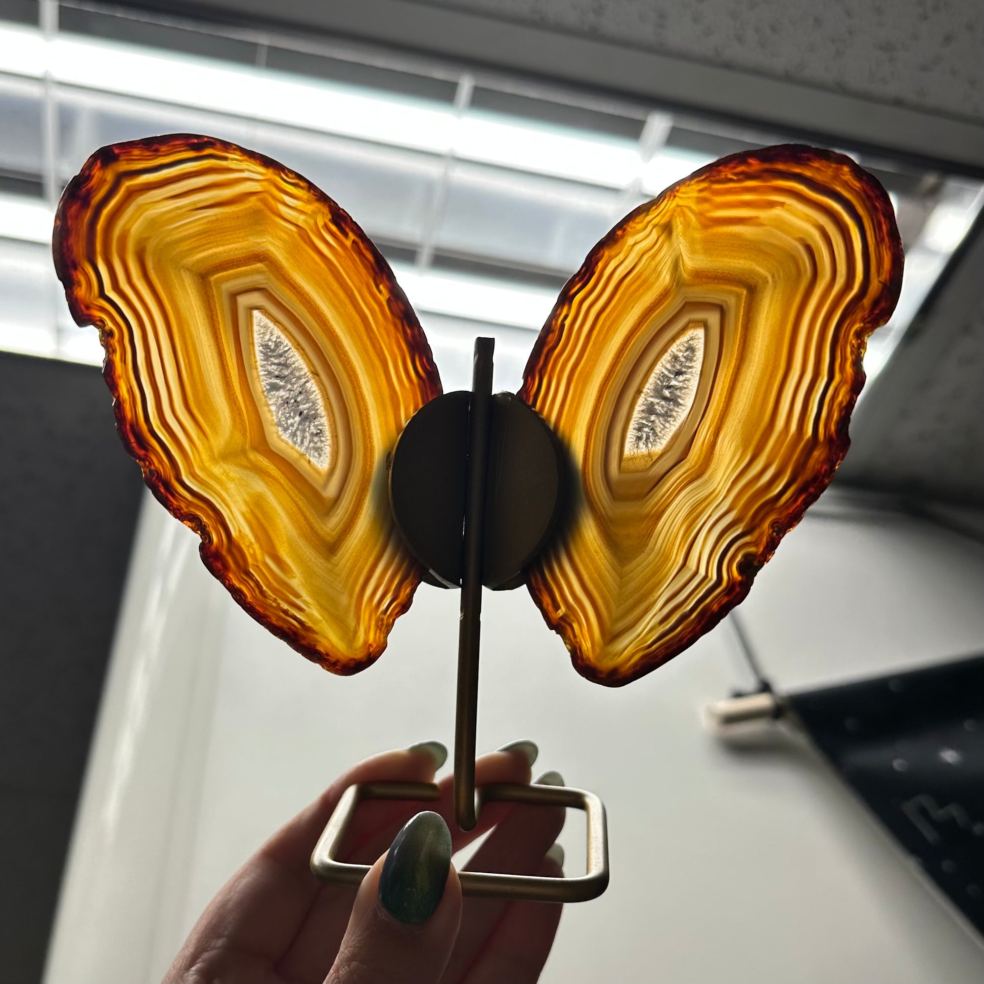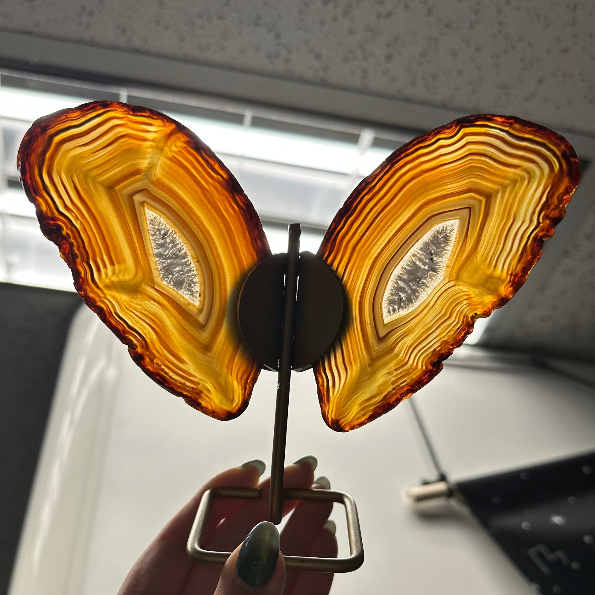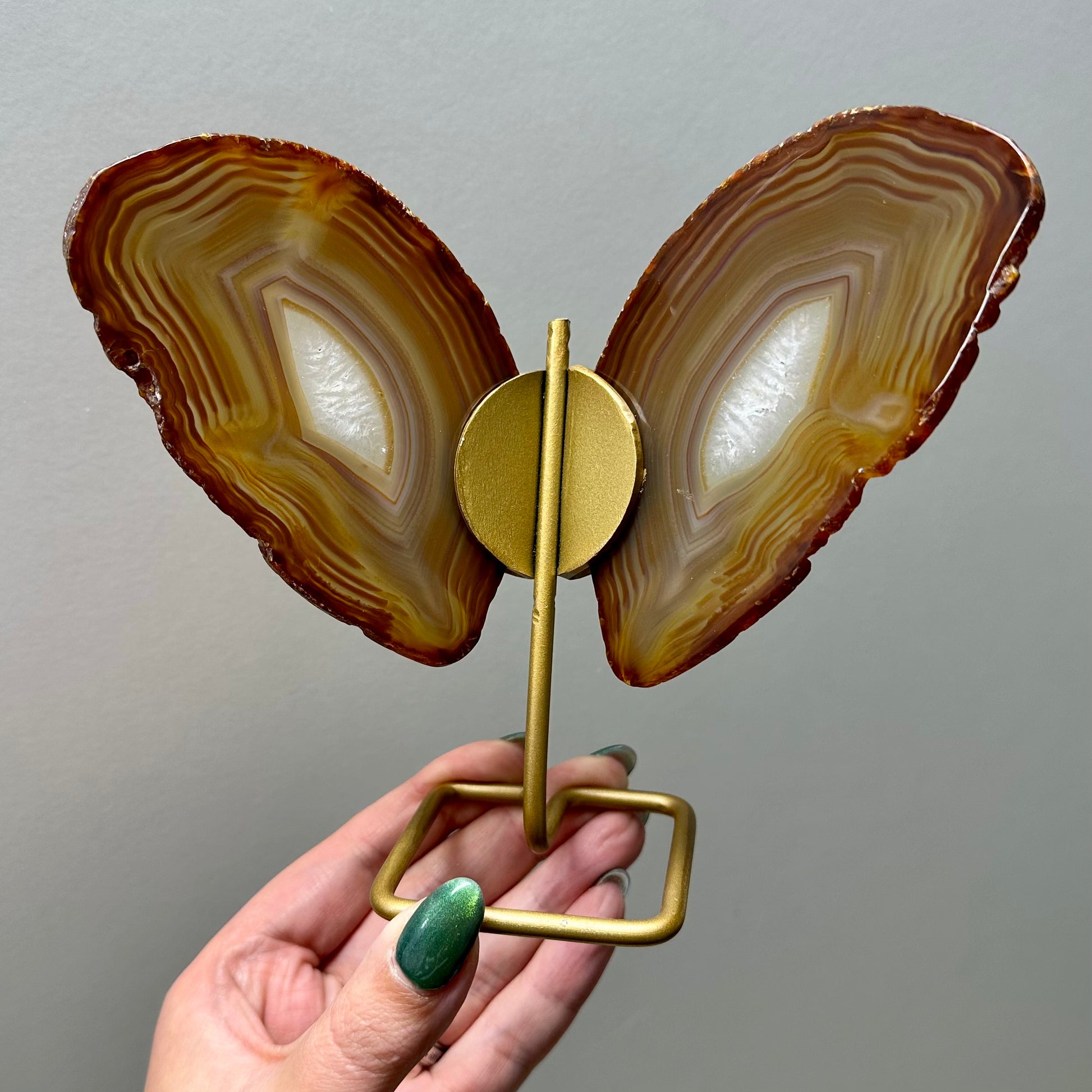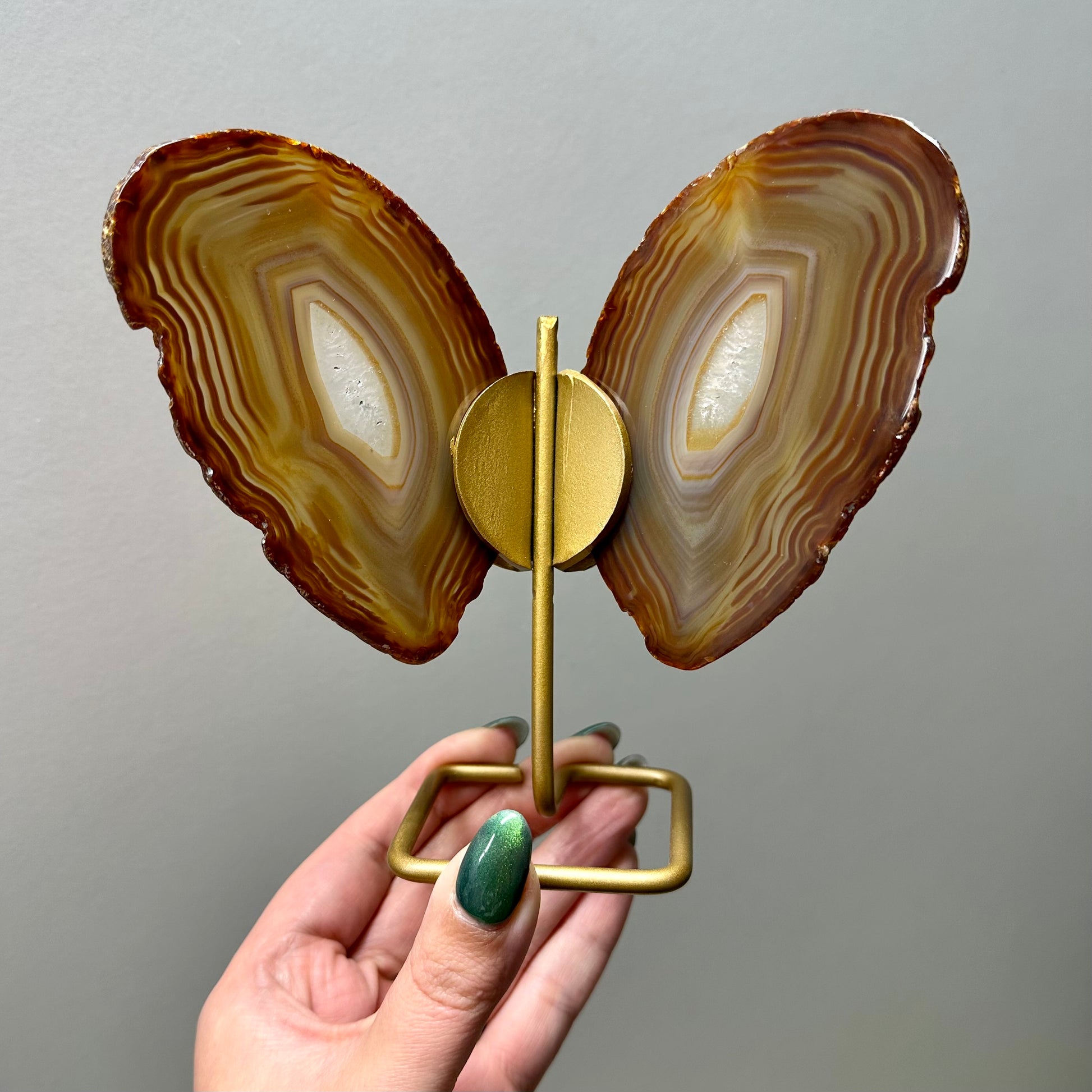 Deze twee vlinders zijn gemaakt van hetzelfde stuk agaat en passen dus perfect bij elkaar. Plaats ze samen als set in jouw interieur.