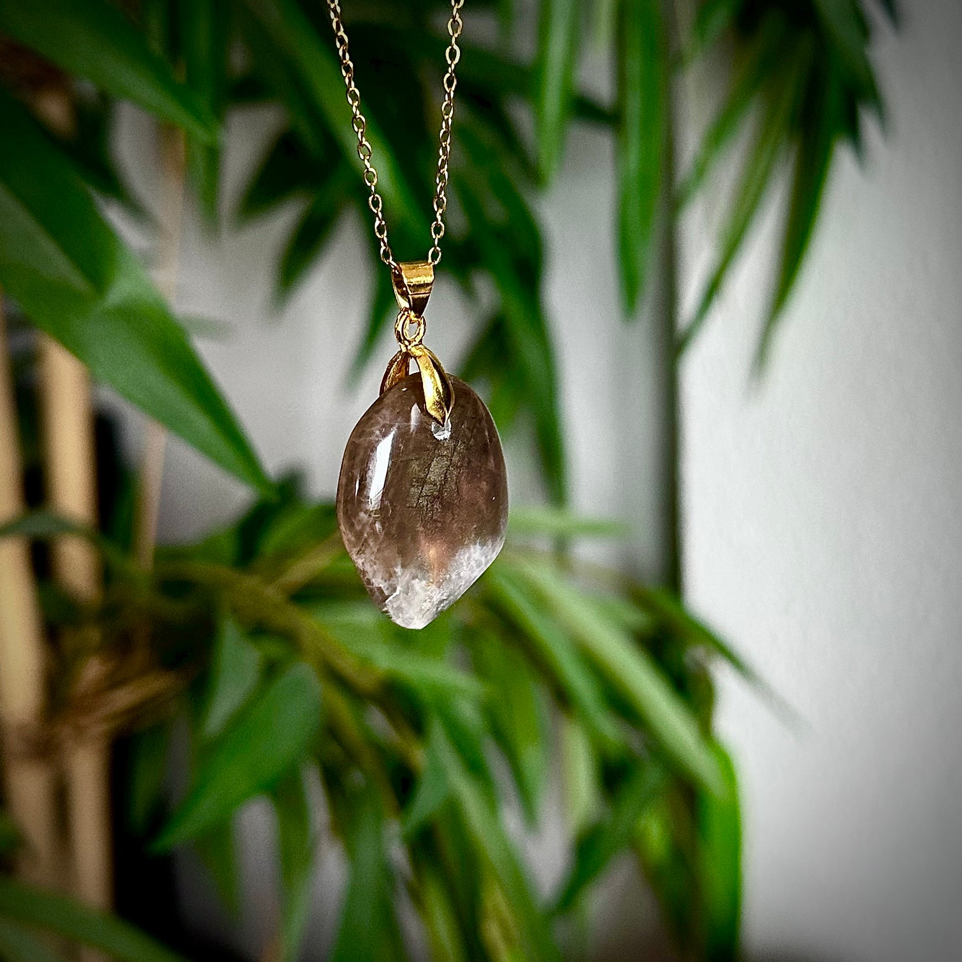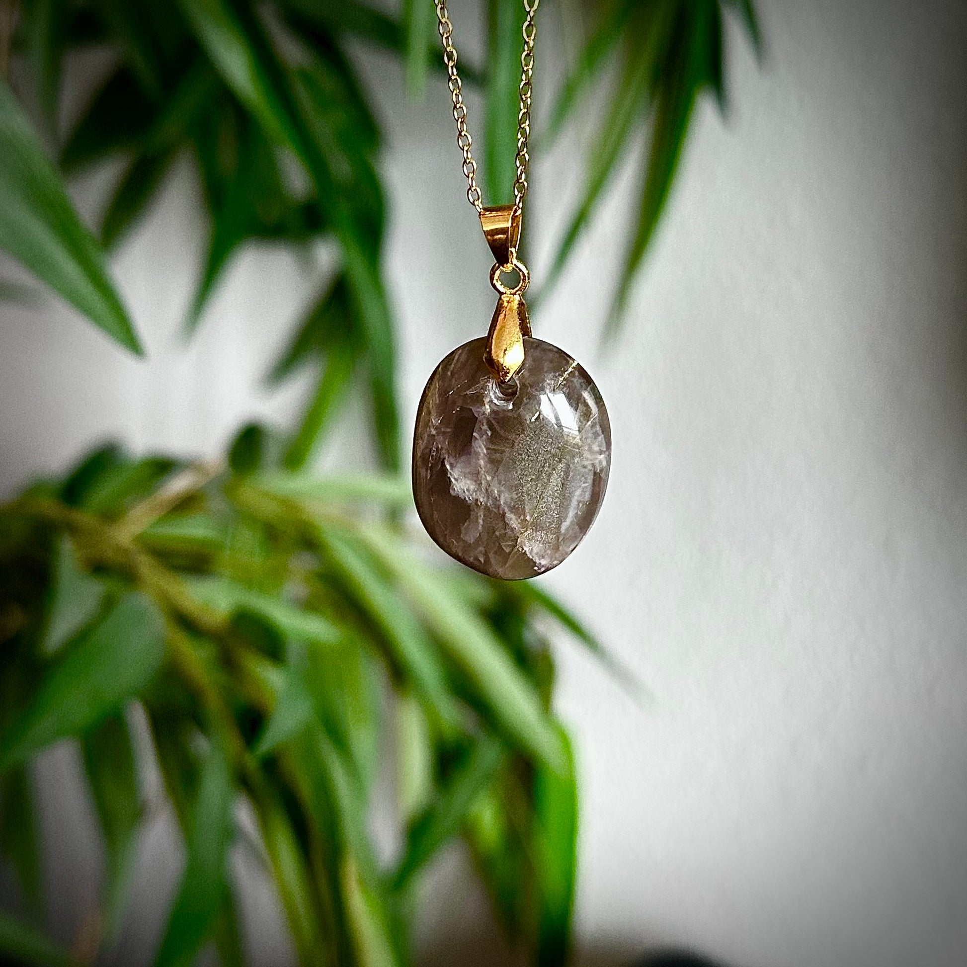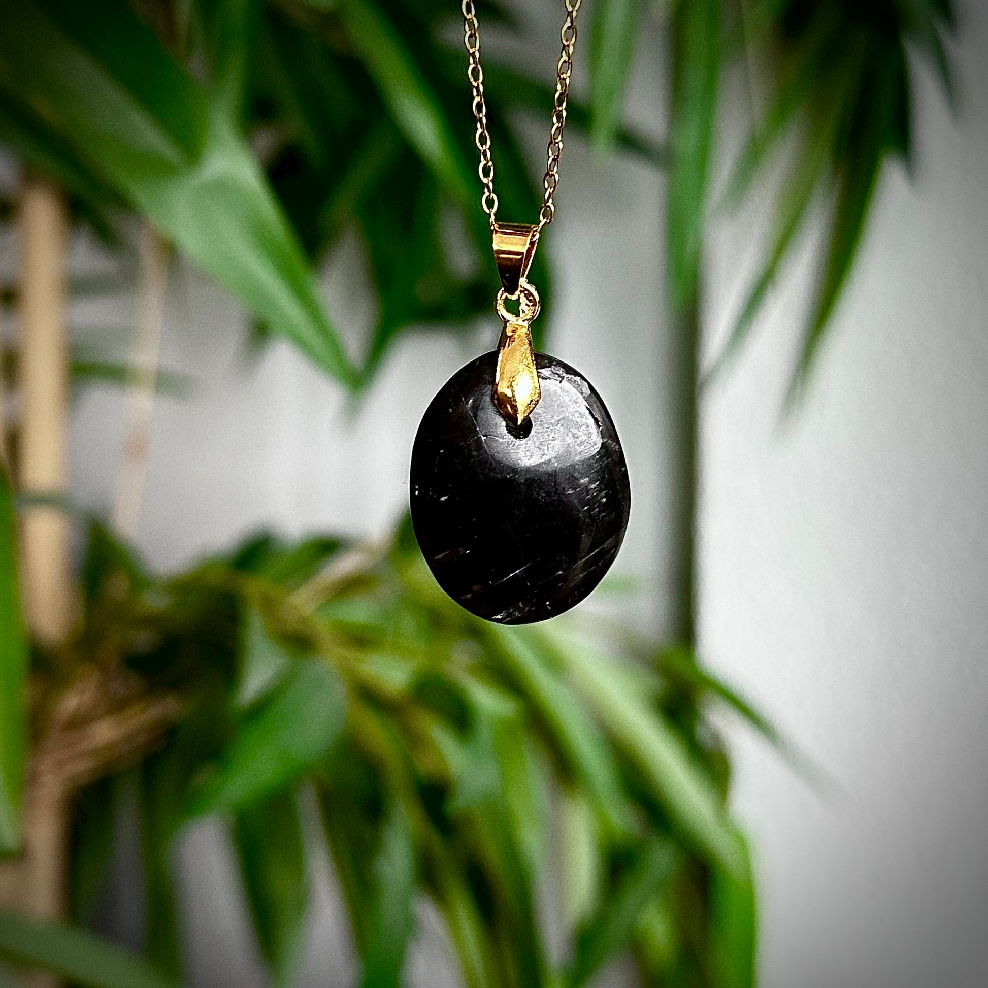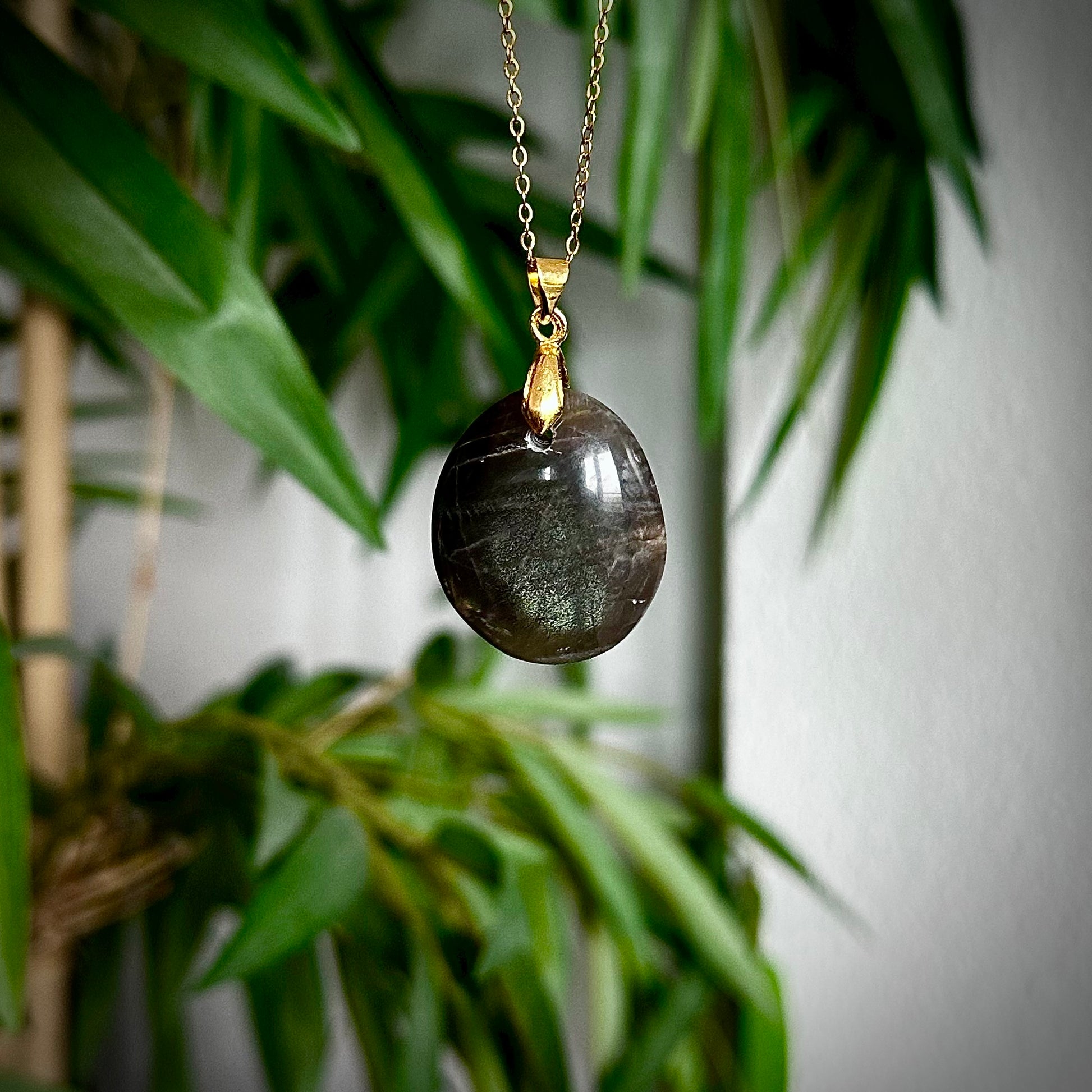 Zwarte maansteen kettinghangers met een goudkleurig hangertje.